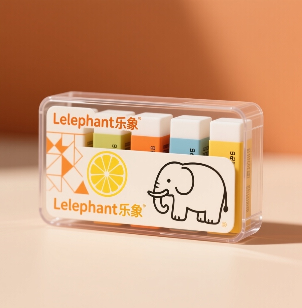 **产品**:5色橡皮擦 **品牌名**:Lelephant乐象 **包装样式**:PP透明盒 **设计风格**:清新手绘极简风 **设计元素**:几何图案、橡皮擦简笔画、大象元素 **主题配色**:暖橙+象牙白+柠檬黄