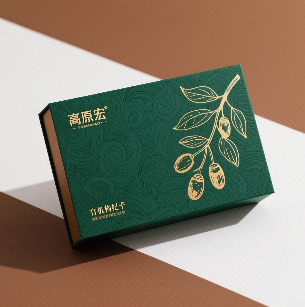 - **产品**:有机枸杞果干 - **品牌名**:高原宏 - **包装样式**:礼盒 - **设计风格**:花纹纹理 - **设计元素**:线条枸杞插画、烫金品牌标识、品牌 slogan - **主题配色**:森林绿、大地棕、纯白