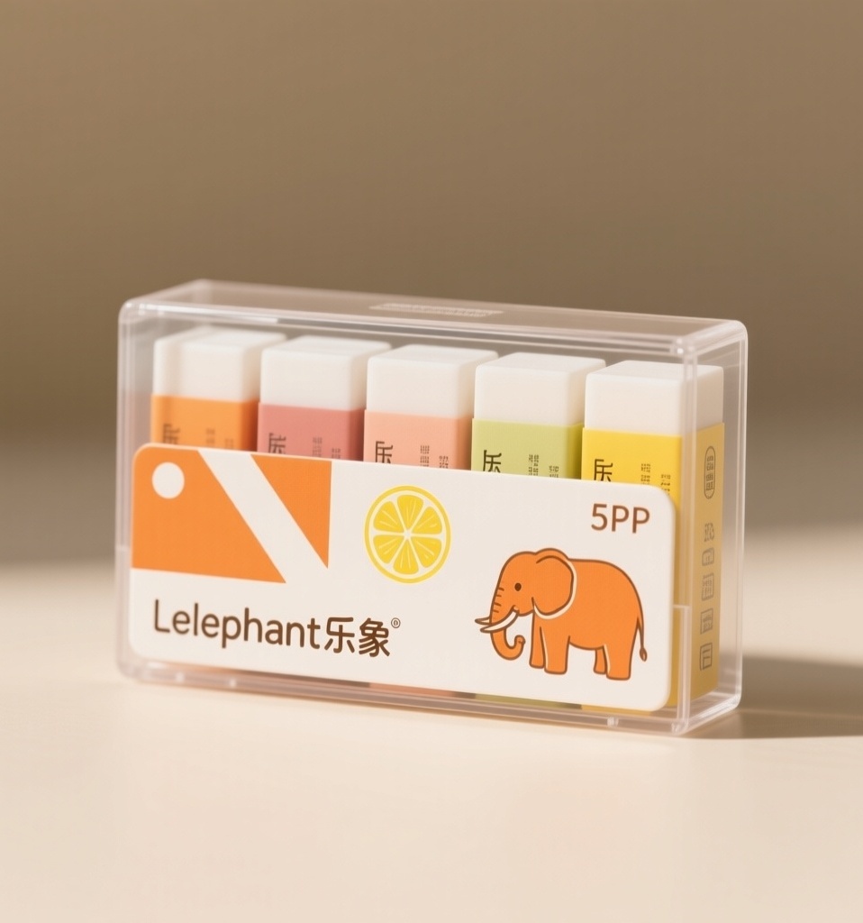 **产品**:5色橡皮擦 **品牌名**:Lelephant乐象 **包装样式**:PP透明盒 **设计风格**:清新极简手绘风 **设计元素**:几何形状、橡皮图案、大象元素 **主题配色**:暖橙+象牙白+柠檬黄