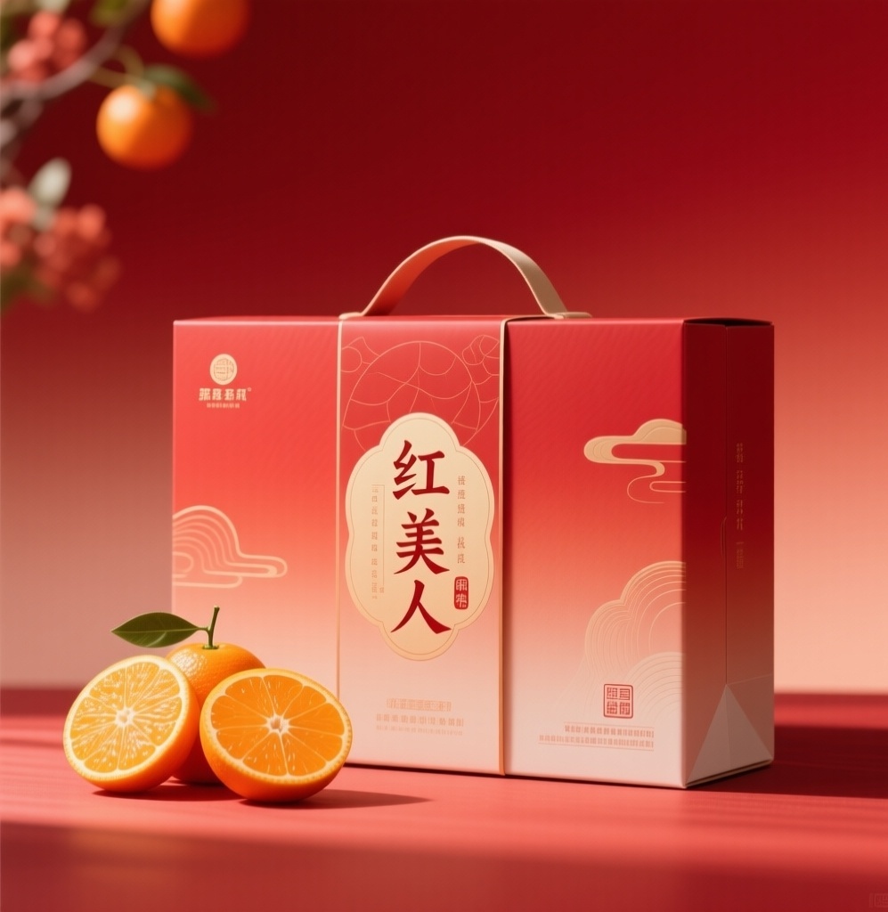 - **产品**:水果橘子礼盒 - **品牌名**:红美人 - **包装样式**:礼品盒 - **设计风格**:古风极简美学 - **设计元素**:弥散渐变、光影层次、全景摄影 - **主题配色**:红色渐变