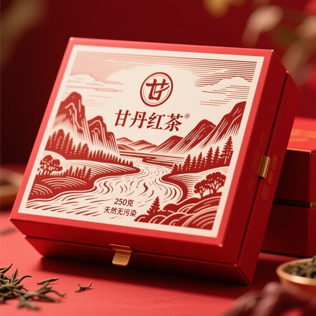 - **产品**:茶叶 - **品牌名**:甘丹红茶 - **包装样式**:礼品盒 - **设计风格**:版画风格 - **设计元素**:山、河流、品牌logo(纤细字体)、产品信息(250克、天然无污染字样) - **主题配色**:红色