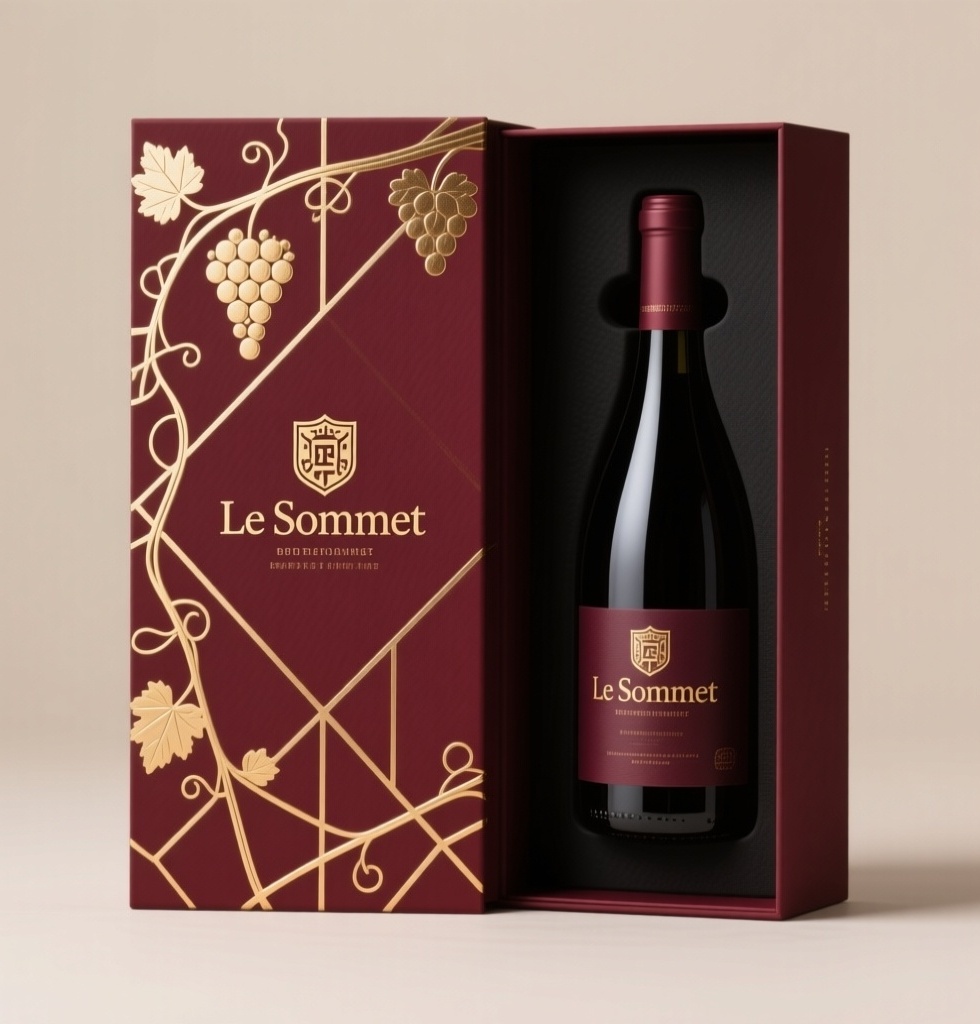 - **产品**:红酒瓶 - **品牌名**:Le Sommet - **包装样式**:礼品盒 - **设计风格**:现代轻奢极简风 - **设计元素**:烫金葡萄藤蔓几何线条、哑光材质基底、浮雕品牌徽章 - **主题配色**:勃艮第红、沙金色、岩黑哑光