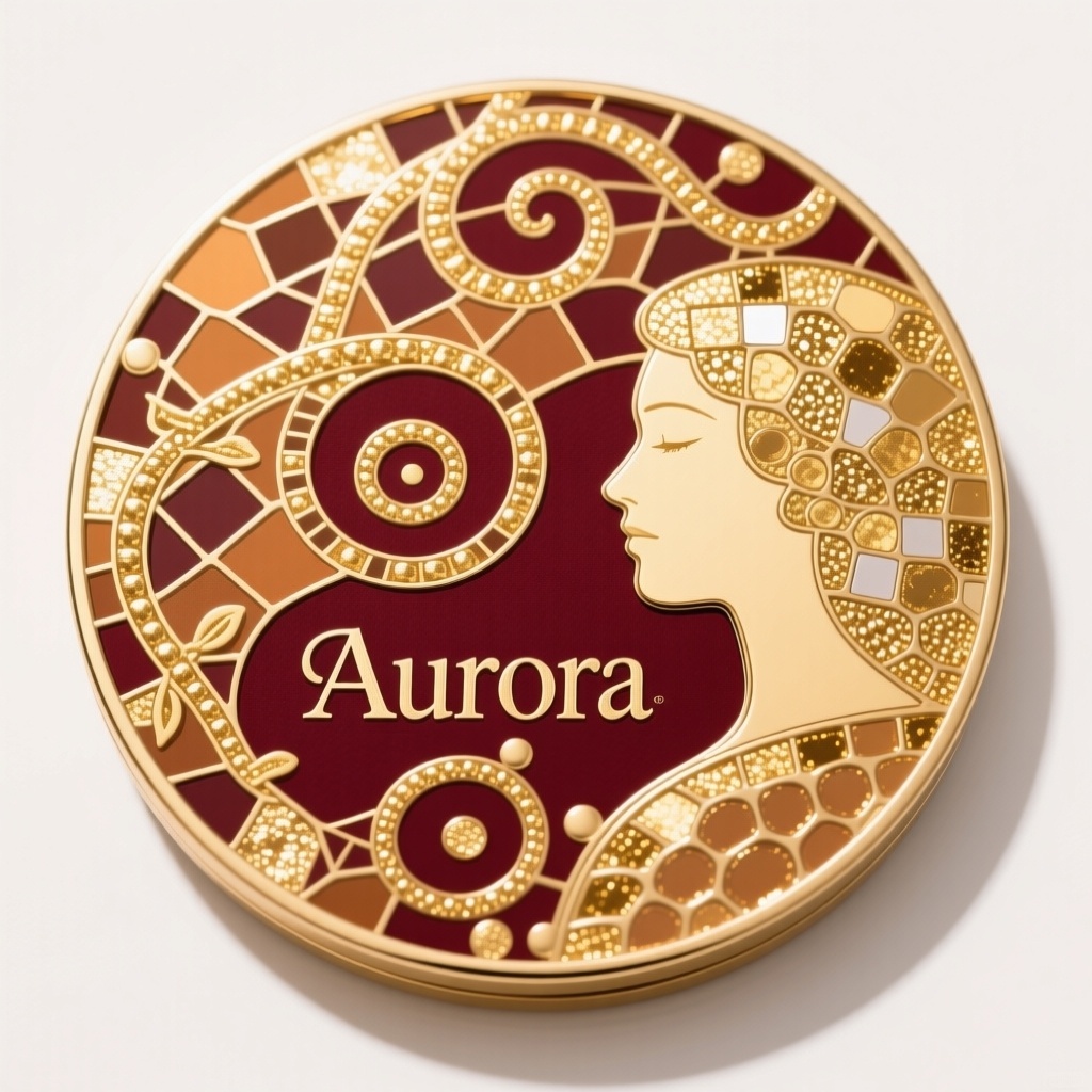 (设计说明:通过克里姆特标志性的黄金分割构图,将眼部轮廓抽象为金色藤蔓缠绕的装饰元素,马赛克色块对应眼影色彩,勃艮第红暗喻画作中的情欲美学,磨砂与镜面工艺再现油画质感)