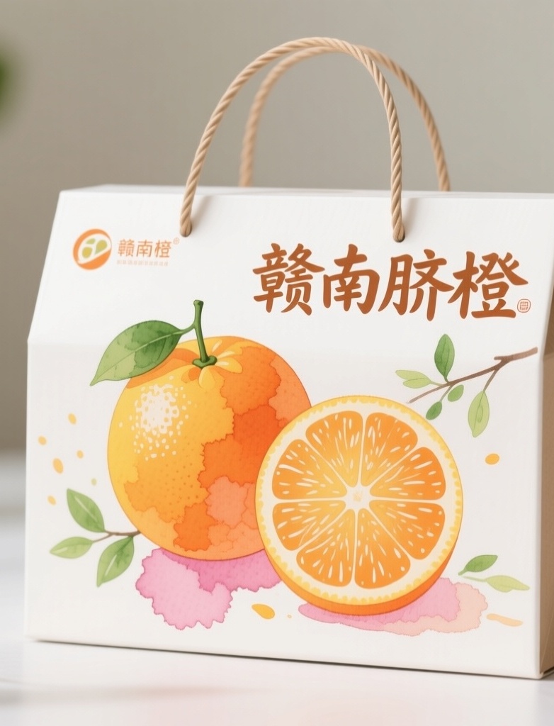 为“赣南脐橙”设计一款手提式礼盒包装,采用柔和细腻的水粉渲染风格,整体呈现手绘艺术感与自然清新气息。主视觉为一颗饱满完整的脐橙与一颗切开后露出多汁果肉的脐橙,果肉纹理以水粉色块自然晕染表现,质感柔软真实;背景采用白色或极浅米色水粉底,营造轻盈透气的视觉空间;细节处点缀少量嫩绿色枝叶,以水彩笔触轻描,增添生机却不喧宾夺主;品牌标识“赣南脐橙”使用圆润的手写风格字体,颜色为深橙或暖棕,巧妙融入画面构图中。主题配色以主色温暖橙色(#FFA500)和阳光黄色(#FFD700)为核心,通过水粉叠色呈现丰富层次;辅助色为纯净白色(#FFFFFF),保持整体清爽;点缀色为清新嫩绿(#90EE90),用于叶片与细节点缀。包装为硬质手提纸盒,表面可做哑光覆膜工艺,强化水粉质感的温润触感。