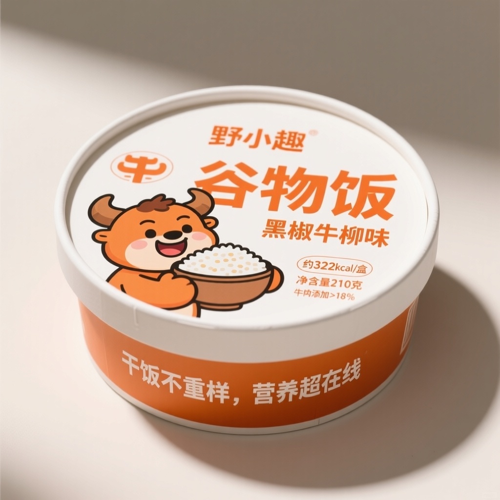 - **产品**:谷物饭 - **品牌名**:野小趣 - **包装样式**:圆形纸盒 - **设计风格**:卡通风格 - **设计元素**:卡通IP形象野小趣捧着米饭碗元气微笑,大标题“谷物饭”,副标题“黑椒牛柳味”,辅助信息热量约322kcal/盒、净含量210克、牛柳添加>18%,底部标语“干饭不重样,营养超在线”,干净背景,白卡纸印刷,柔和棚拍光影 - **主题配色**:落日橙主色,白色辅色