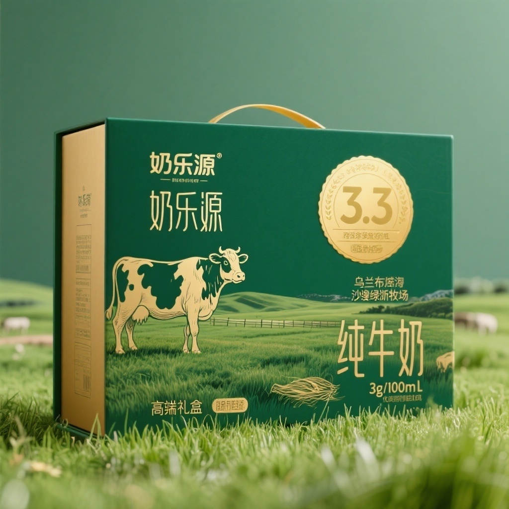 - **产品**:有机纯牛奶 - **品牌名**:奶乐源 - **包装样式**:礼品盒 - **设计风格**:自然写实牧场风 - **设计元素**:草原奶牛图案、金色圆形标识(含3.3文字)、文字信息(奶乐源纯牛奶、乌兰布和沙漠绿洲牧场、3g/100mL优质乳蛋白) - **主题配色**:草绿色与金色