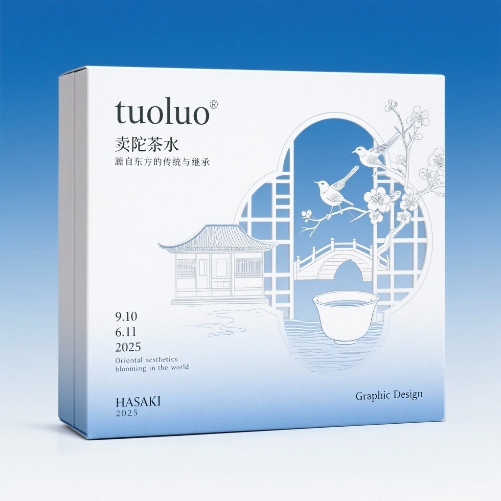 - **设计元素**:高级排版,新中式美学,中国当代艺术风格,新中式宋代主题,国风美学,高饱和渐变背景,超现实,剪纸风格,小桥流水人家剪影,喜鹊围绕,麻雀停留,宋代窗花样式,树枝花朵插入,茶杯,渐变和肌理磨砂处理,造型柔和,中式建筑,中式花纹,不透明和半透明质感,蓝白渐变色,工笔画,层次感,弥散渐变,细节满满;左上标题“tuoluo”细衬线体放大,下方“卖陀茶水”,下方“源自东方的传统与继承”,左下方日期“9.10”、“6.11”、“2025”,点缀小字“Oriental aesthetics blooming in the world”衬线体,底部左下“HASAKI”极小号字体,底部左下“2025”极小号字体,右下“Graphic Design”极小号字体衬线体