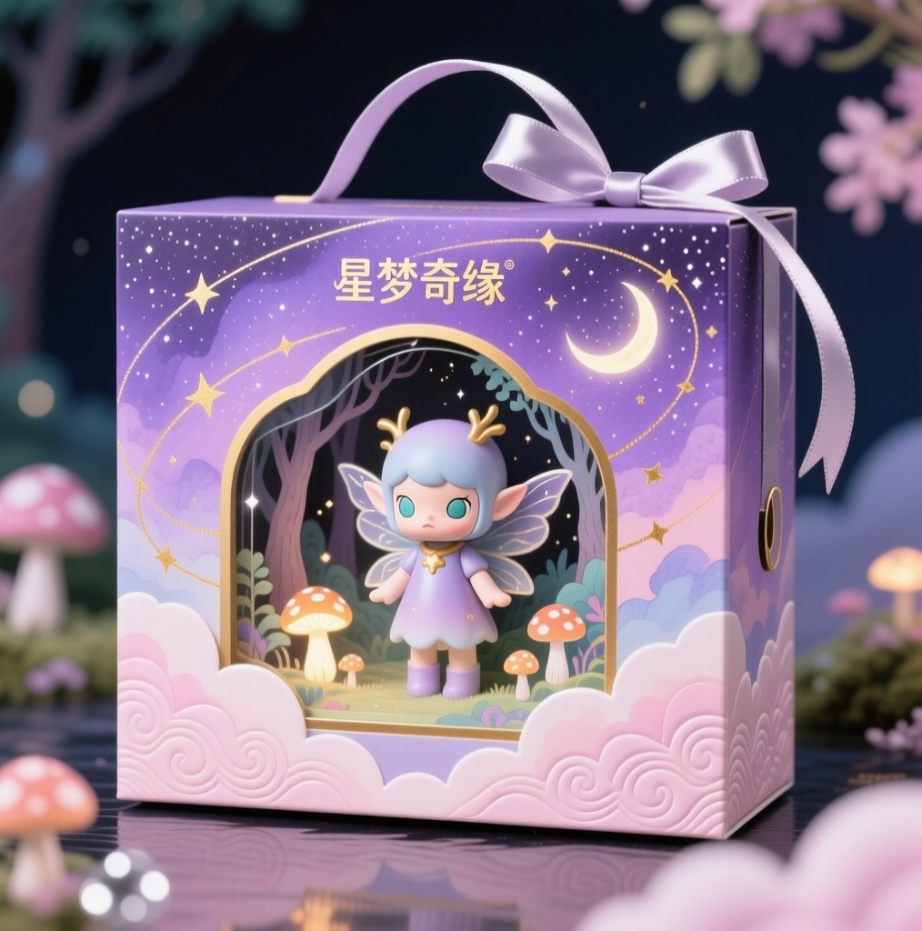 - **产品**:玩偶礼盒 - **品牌名**:星梦奇缘 - **包装样式**:天地盖礼品盒 - **设计风格**:梦幻水彩插画风 - **设计元素**: 1. 烫金星空轨迹线条 2. 半透明窗展示玩偶主体 3. 手绘森林精灵与发光蘑菇 4. 凹凸压纹云朵底纹 5. 缎带提手穿孔设计 - **主题配色**: 主色:银河紫渐变(#5E4F8F → #9B90C2) 辅色:晨曦粉(#FFD6E7) 点缀色:流光金 + 月光银