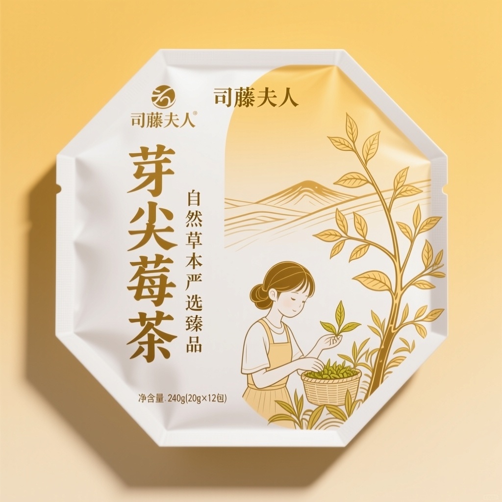 - **产品**:芽尖莓茶 - **品牌名**:司藤夫人 - **包装样式**:八边封自封袋 - **设计风格**:中式风格,自然、质朴、精致 - **设计元素**:茶山插画(右侧大幅,写实线条,暖金色填充,茶树细长,叶子小巧),少女采茶插画(右侧大幅,写实线条,暖金色填充)、暖黄色渐变背景、书法风格"芽尖莓茶"大字(左侧竖排)、小字"自然草本严选臻品"(竖排)、净含量"240g(20g×12包)"、轻微投影效果 - **主题配色**:白色(主色)、暖金色(点缀色)