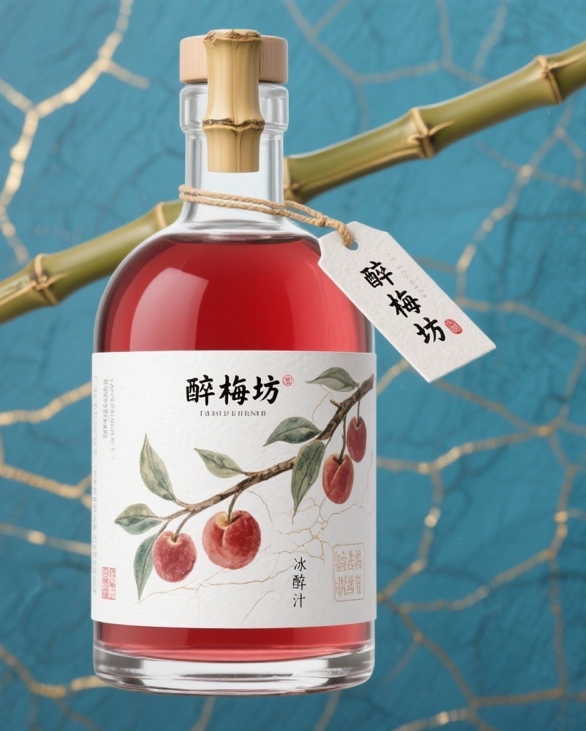 - **产品**:话梅冰醉汁 - **品牌名**:醉梅坊 - **包装样式**:玻璃瓶 - **设计风格**:复古清新,融合手绘插画与水墨元素 - **设计元素**:瓶身正面手绘话梅枝图案,背面冰裂纹理烫金线条,瓶颈处悬挂竹节造型标签 - **主题配色**:主色:梅红(#C21E56) + 冰蓝(#6EC6CA) + 宣纸白