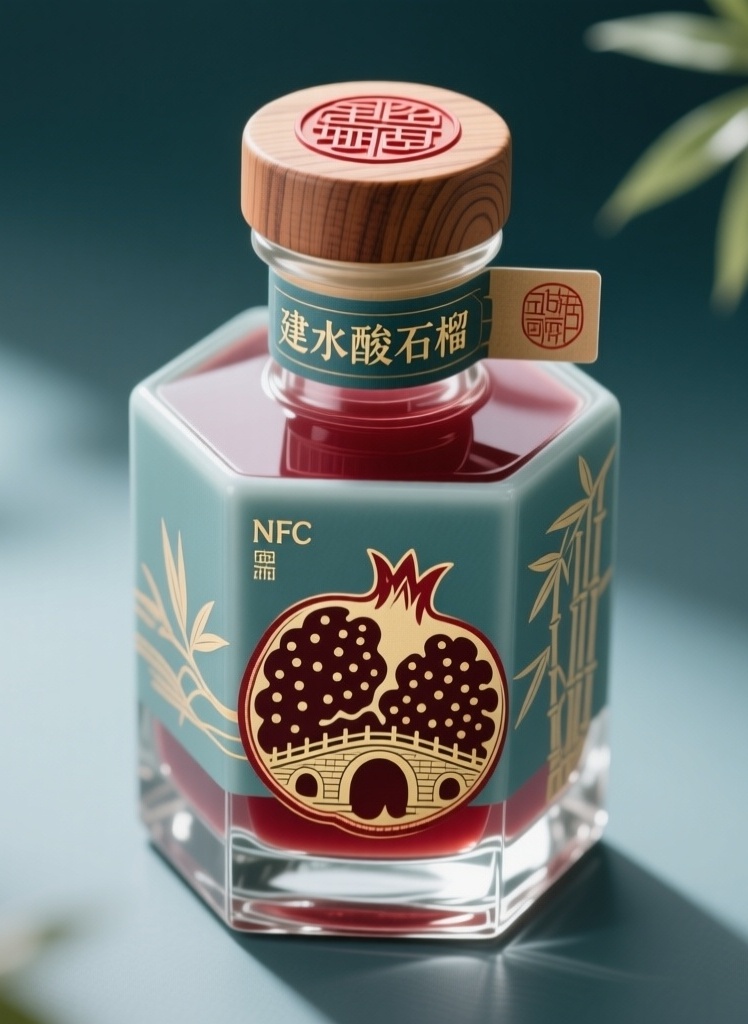| **主标设计** | 黛青底+激光镂空石榴剪影 | 透出瓶内果汁色形成「悬浮石榴」效果 |