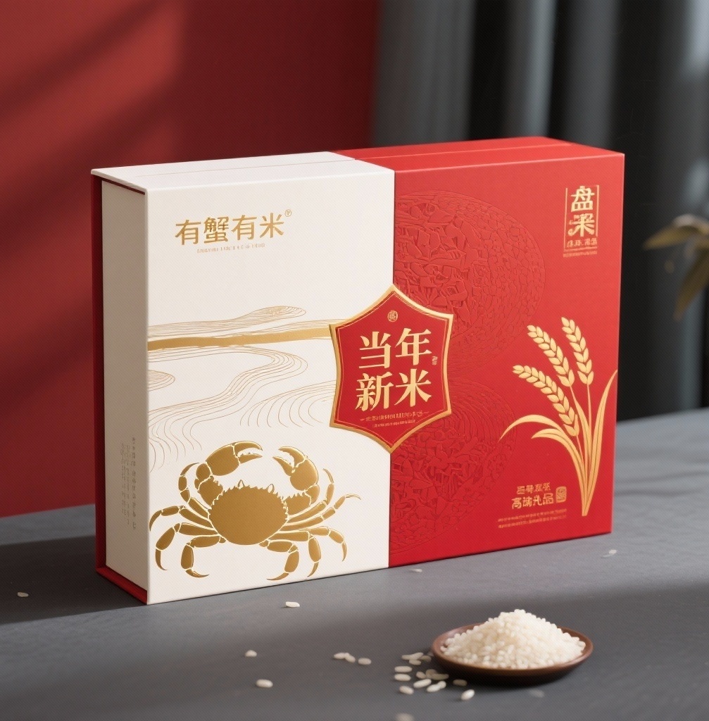 - **产品**:盘锦大米 - **品牌名**:有钳有米 - **包装样式**:礼品盒 - **设计风格**:商务简约 - **设计元素**:抽象盘锦湿地线条、螃蟹剪影、烫金"当年新米"标识、米粒肌理底纹、丰收稻穗图形 - **主题配色**:赤霞红、米白、深灰(辅助) (注:根据指令精准替换丹顶鹤为螃蟹剪影,保留湿地线条与稻穗图形,配色仍以红、白为主,深灰辅助强化层次感)