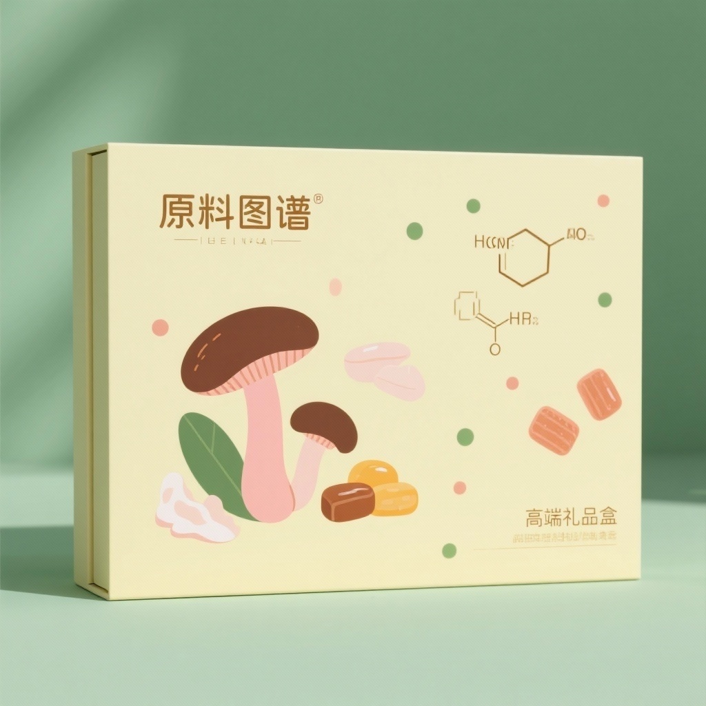 - **产品**:灵芝保健品 - **品牌名**:原料图谱 - **包装样式**:礼品盒 - **设计风格**:清新简约风 - **设计元素**:扁平风格原料插画、灵芝图案、软糖图像、分子式图案、散点构图 - **主题配色**:浅奶油黄底色,抹茶绿与淡珊瑚粉辅助色,巧克力棕文字色