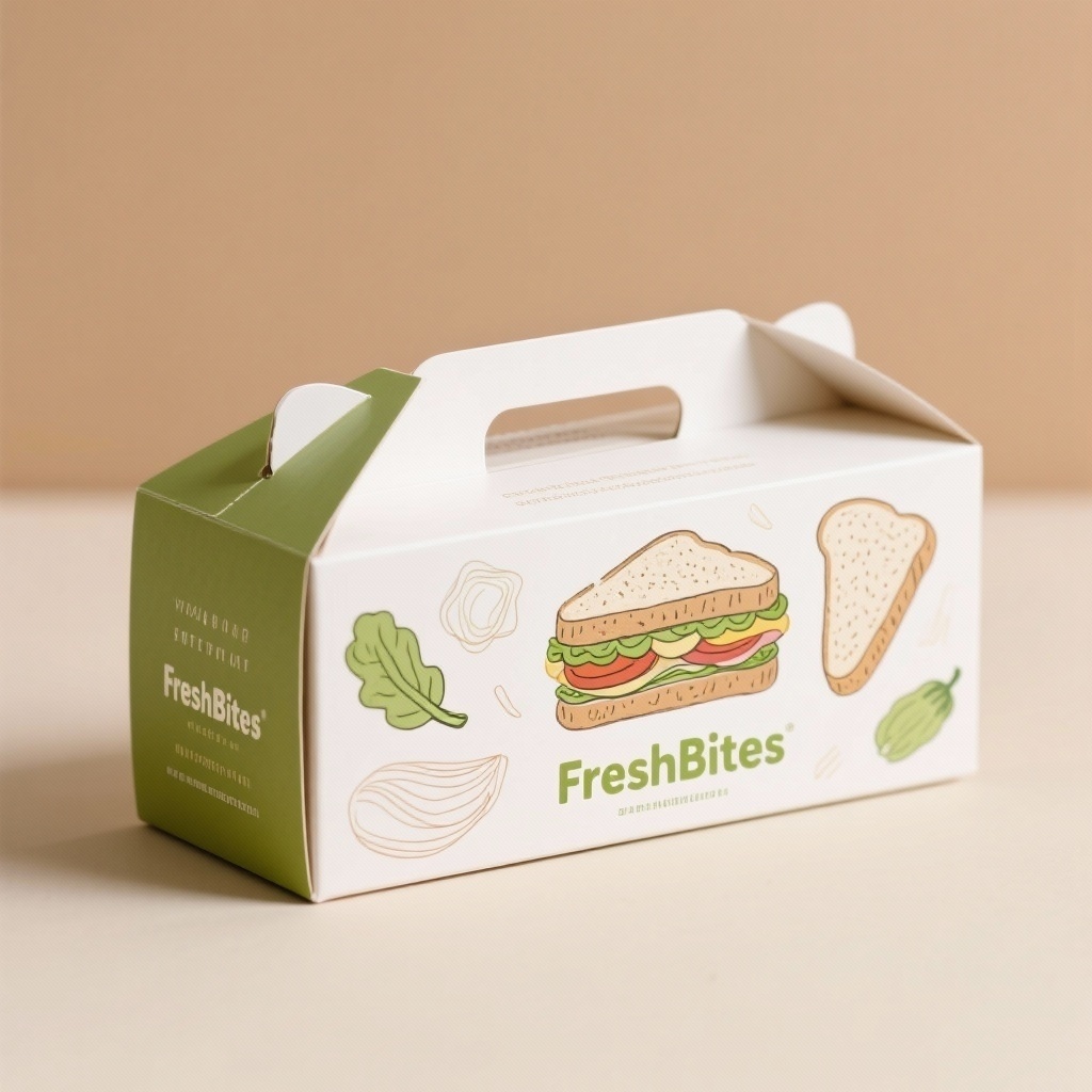 - **产品**:三明治 - **品牌名**:FreshBites - **包装样式**:折叠纸盒 - **设计风格**:简约手绘插画风格 - **设计元素**:手绘三明治食材插图、蔬菜线条图案、面包纹理草图 - **主题配色**:淡棕色、柔和绿色、米白色