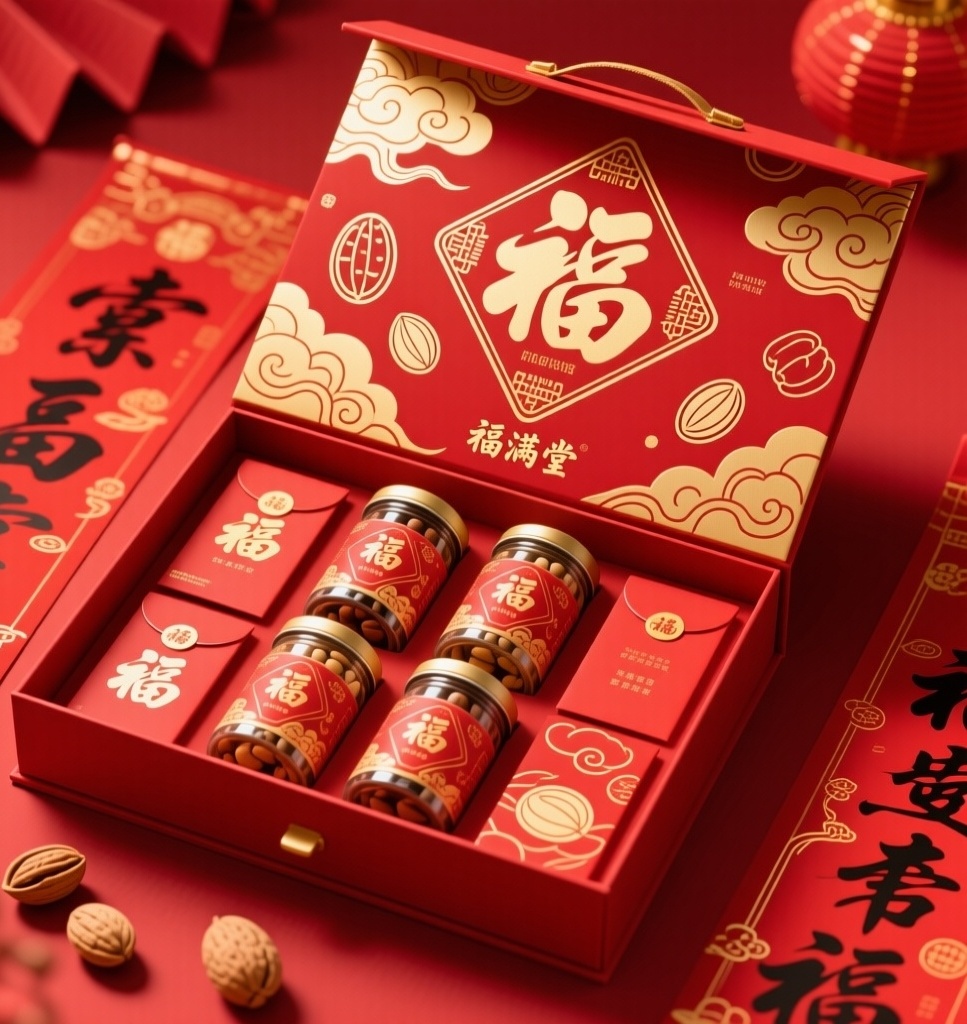 **产品**:节日礼品套装(对联、福字、红包、四盒罐装坚果) **品牌名**:福满堂 **包装样式**:礼品盒 **设计风格**:传统喜庆风格 **设计元素**:祥云纹饰、福字书法、红包图案、坚果简笔画 **主题配色**:红色、金色