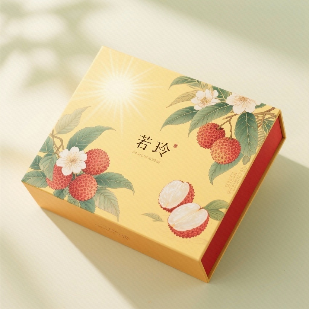 - **产品**:荔枝 - **品牌名**:若玲 - **包装样式**:礼品盒 - **设计风格**:工笔国画渲染 - **设计元素**:工笔荔枝簇拥热带叶丛、花朵图案、水果切片细节与阳光光晕效果 - **主题配色**:柔和的黄色、红色渐变与浅绿色点缀