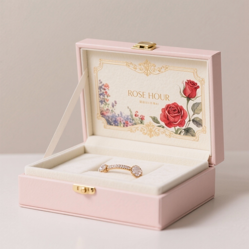 - **产品**:首饰包装礼盒 - **品牌名**:ROSE HOUR - **包装样式**:天地盖盒 - **设计风格**:莫兰迪水彩风格、艺术插画、浮雕边框设计 - **设计元素**:莫奈花园红玫瑰水彩插画、浅金色浮雕边框、哑光米白丝绒内衬 - **主题配色**:灰调红玫瑰色、雾霾粉、浅砂金色、象牙米白 (设计说明:采用莫兰迪低饱和色调呈现印象派花园意境,灰调红玫瑰与雾霾粉交织形成朦胧花丛,浅砂金色浮雕边框呼应油画框质感,象牙米白丝绒内衬提升开盒仪式感)