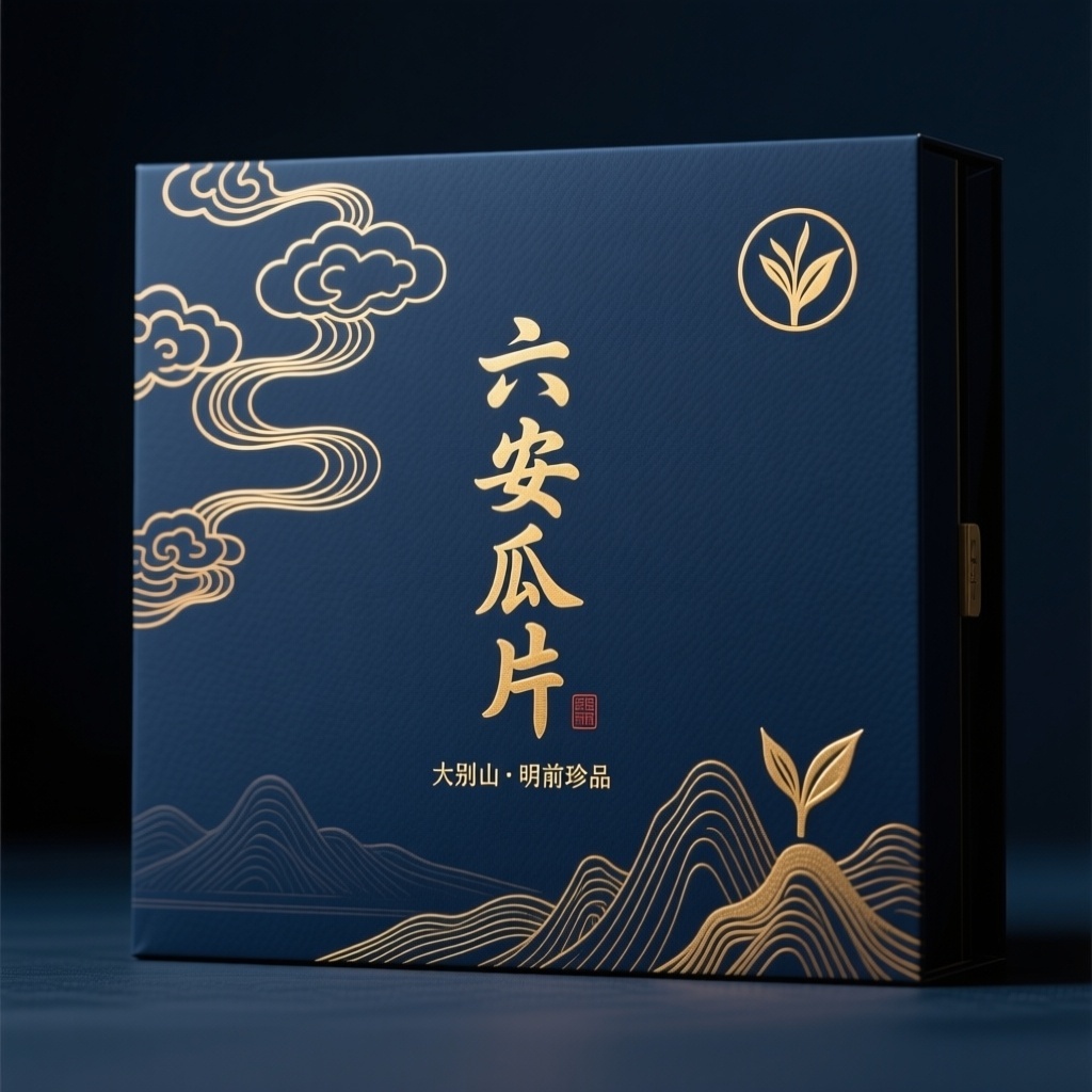 一个高端的礼品盒包装,用于六安瓜片茶叶,采用深蓝+金色典雅东方风格,融合传统书画美学与现代极简表达。品牌名是“六安瓜片”。设计元素包括:哑光深蓝底色上压印极细金线云纹,中央竖排烫金书法体“六安瓜片”,下方小字“大别山·明前珍品”,右侧圆形徽章含抽象茶芽与山形组合。整体氛围宁静高贵,体现非遗技艺与山云养茶的文化底蕴。