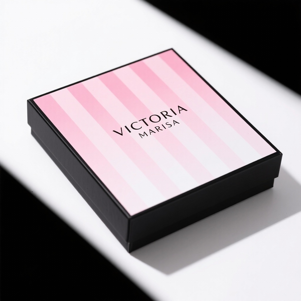 - **产品**:高端美妆礼盒 - **品牌名**:VICTORIA MARISA - **包装样式**:礼品盒 - **设计风格**:简约优雅时尚风 - **设计元素**:粉白渐变竖条纹底纹、黑色无衬线品牌字体、黑色硬质包边轮廓、纯白背景衬托 - **主题配色**:粉色、浅粉色、黑色