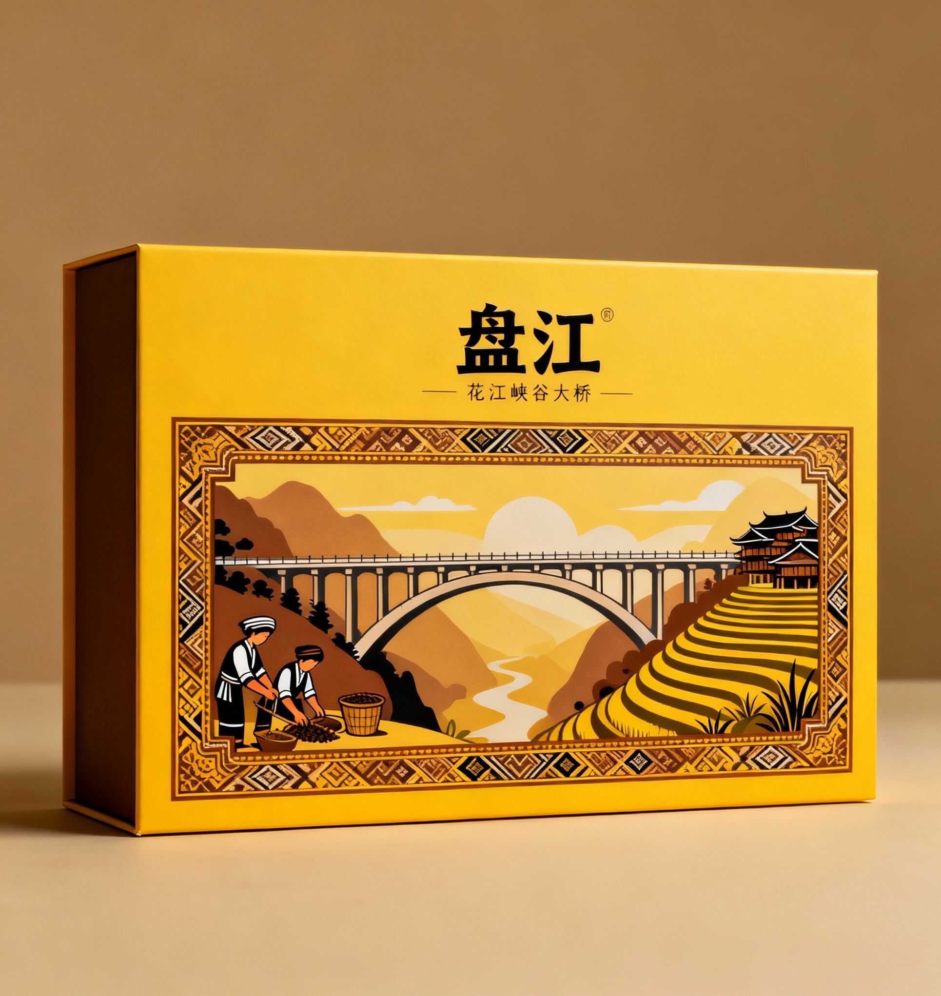 - **产品**:豆豉 - **品牌名**:盘江 - **包装样式**:礼品盒 - **设计风格**:插画风格 - **设计元素**:花江峡谷大桥全景插画、布依族传统纹样边框、布依族人物劳作场景、梯田与吊脚楼背景装饰 - **主题配色**:黄色、褐色、黑色