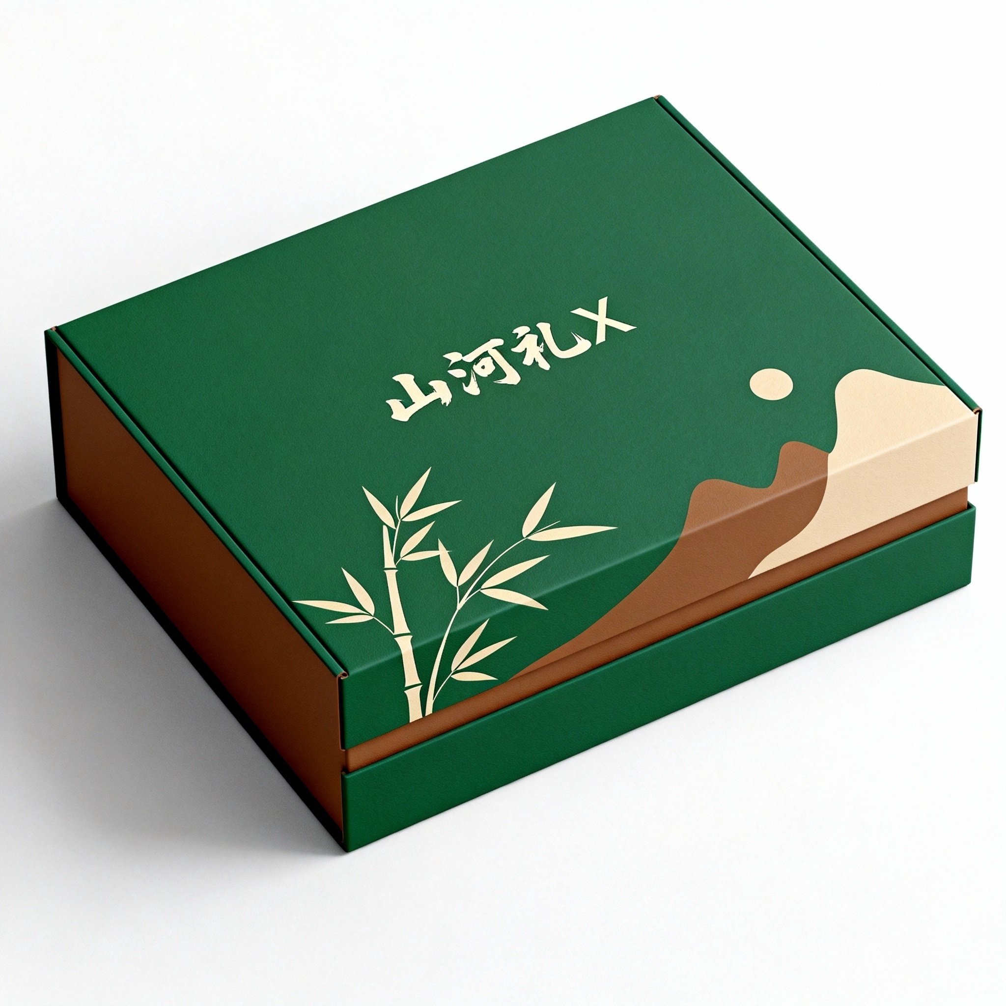 - **产品**:南阳黄金小米 - **品牌名**:山河礼X - **包装样式**:礼品盒 - **设计风格**:简约自然风 - **设计元素**:竹叶图案、山脉轮廓、手写体品牌标识、留白空间营造呼吸感 - **主题配色**:绿色、棕色、米色