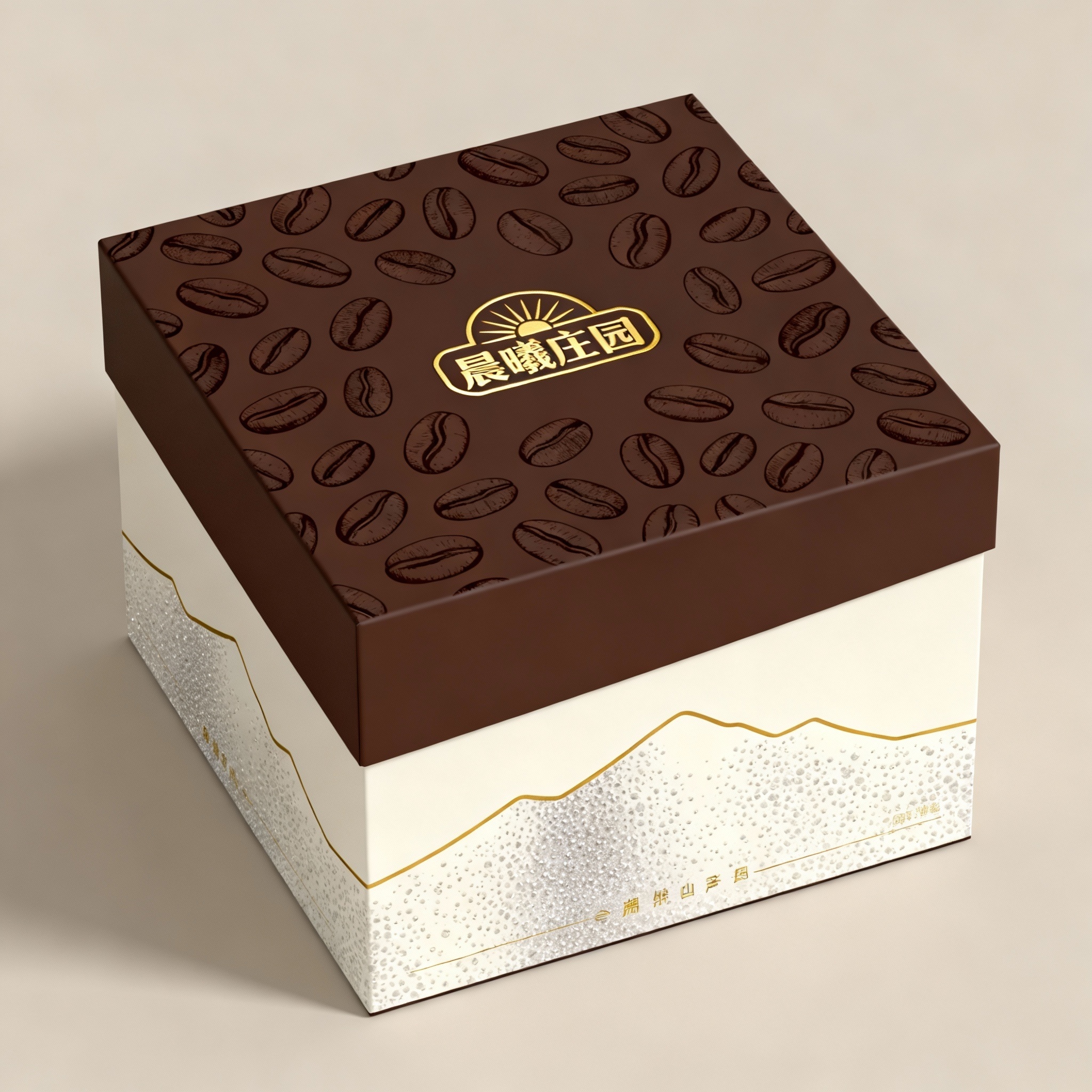 - **产品**:精品手冲咖啡豆 - **品牌名**:晨曦庄园 - **包装样式**:礼品盒 - **设计风格**:极简自然风 - **设计元素**:手绘咖啡豆图案、烫金品牌标识、磨砂质感底纹、产地山形轮廓线 - **主题配色**:深棕 / 米白 / 金