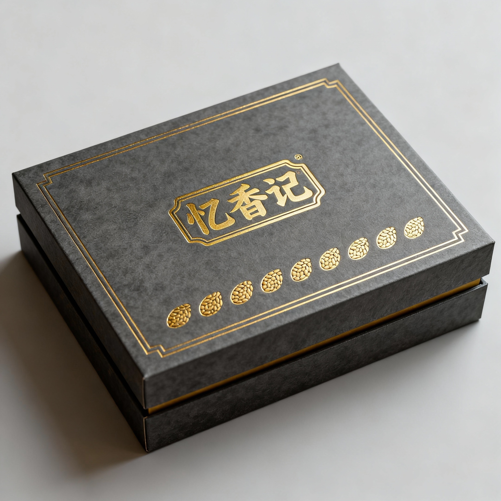 - **产品**:无糖芝麻酥 - **品牌名**:忆香记 - **包装样式**:礼品盒 - **设计风格**:经典怀旧风 - **设计元素**:烫金品牌标识、芝麻图案、简约边框 - **主题配色**:深灰与烫金