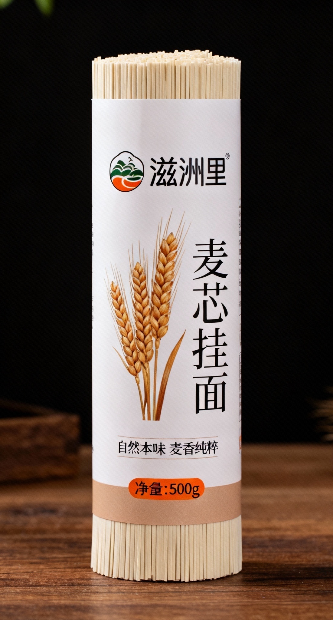 - **产品**:麦芯挂面 - **品牌名**:滋洲里 - **包装样式**:一捆 - **设计风格**:简约自然风 - **设计元素**:麦穗图案、品牌标识、产品名称、企业标语、净重标注 - **主题配色**:米白、浅褐、暖橙