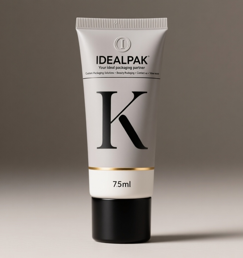 - **设计元素**:背景为Pantone Warm Gray 3C哑光质感管身;主图案为无图形纯文字排版,重点突出定制化英文字体设计的“IDEALPAK”,字母“I”与“K”做纤细拉长与末端微翘处理,增强识别度;装饰元素包含底部0.5mm宽香槟金细线环带、盖顶中央凹印品牌首字母“I”浮雕徽标;材质选用高密度复合软管料,触感柔滑抗指纹。