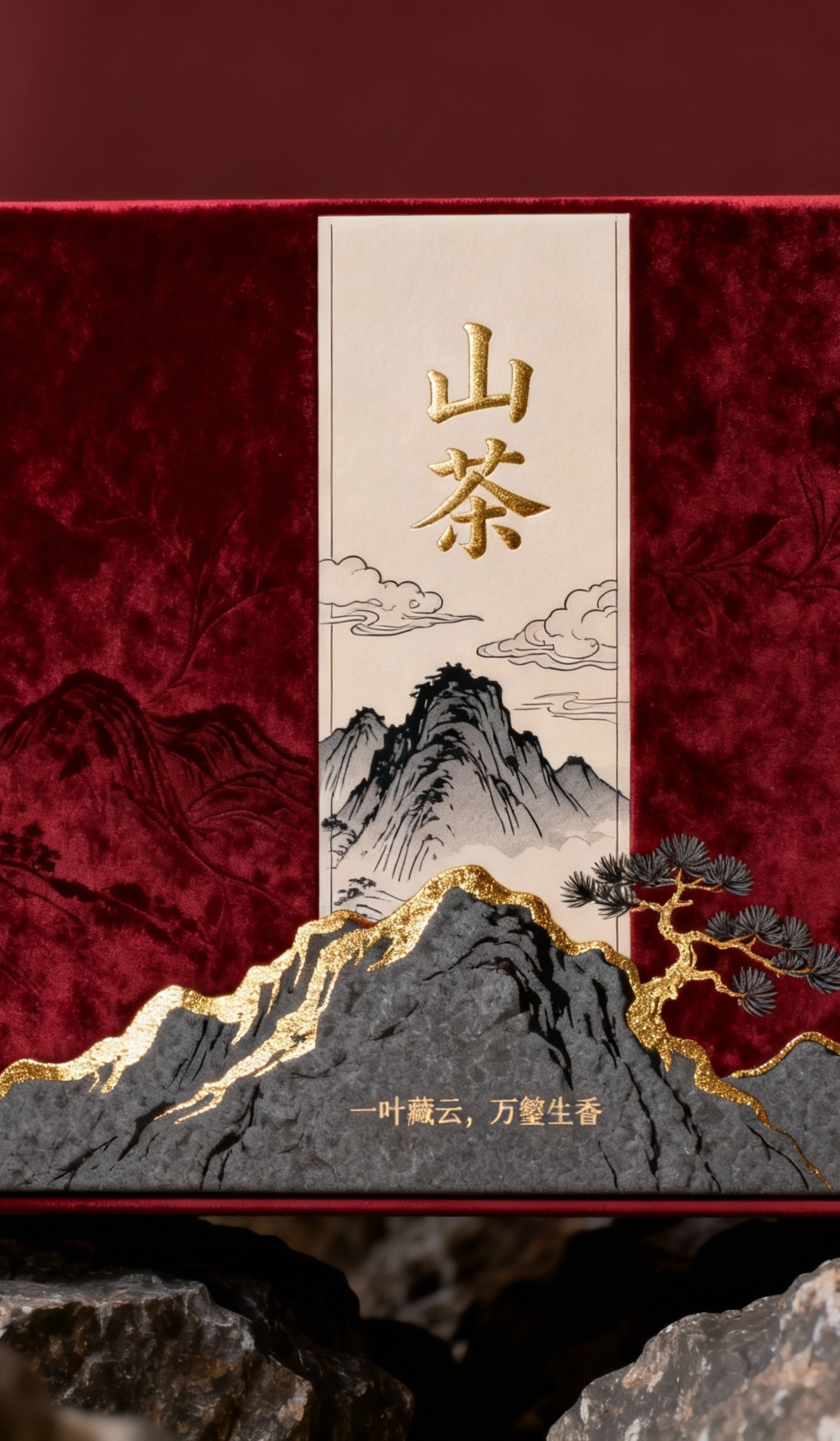 一个高端的茶叶礼品盒,设计元素包括纵向布局的山水线描图案,用于山茶品牌茶叶,采用传统中式奢华风格,"山茶"是品牌名,主色调为酒红色,点缀色为哑光烫金色,辅助色为深灰岩石色。盒面背景为酒红色丝绒压纹底材,中央有精细的山水线描,山势由浓至淡,云气若隐若现,局部以哑光烫金勾勒山脊与松枝轮廓。"山茶"二字居中置于主视觉上方,采用行楷字体,烫金处理。盒盖底部有小字号宣传文案"一叶藏云,万壑生香",颜色为深灰岩石色。整体设计典雅、沉稳且富有文化韵味。