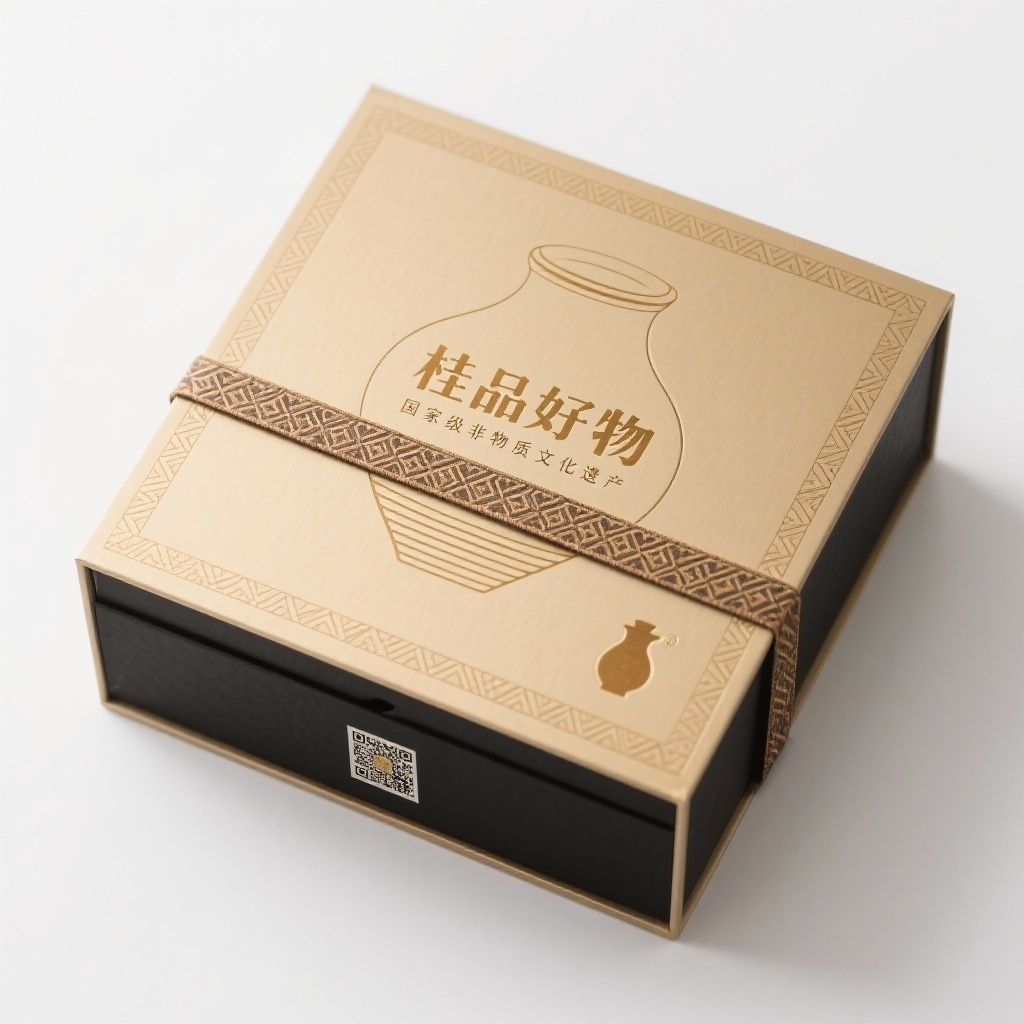 - **设计元素**:背景层为古铜金特种纸自带金属哑光质感;主图案为抽象化坭兴陶轮廓线描图,低调烫哑金;装饰图案为极细线条构成的壮锦几何单元纹样,沿盒盖边缘内缩2cm处环绕;配一条宽1.5cm壮锦纹丝带横向捆扎于盒体中部;无多余图标,仅在背面底部嵌入二维码小标。
