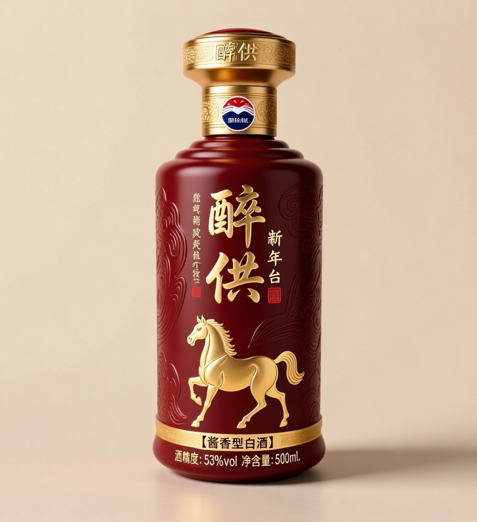 围绕高端酱香白酒典藏气质,设计竖向长方形瓶贴正稿,面向追求文化深度与收藏价值的高端消费群体,融入品牌核心标识「醉供」与马年文化符号。设计内容为:主标题「醉供」竖向排布,采用定制厚重书法体,以烫金+轻微击凸工艺呈现,凸显金属厚度与庄重感;其下方配一匹简化金色浮雕轮廓马形,姿态昂首缓行,线条凝练有力,象征吉庆与供奉,尺度克制不夺主。底色为深暗红哑光丝绸纹理,辅以极低对比度暗纹增强层次,画面干净克制。底部理性排版信息:【酱香型白酒】酒精度:53%vol 净含量:500ml。材质选用细腻哑光触感纸,工艺融合烫金、击凸与浮雕,整体气质贴近茅台新年酒体系,沉稳耐看,极具典藏价值。