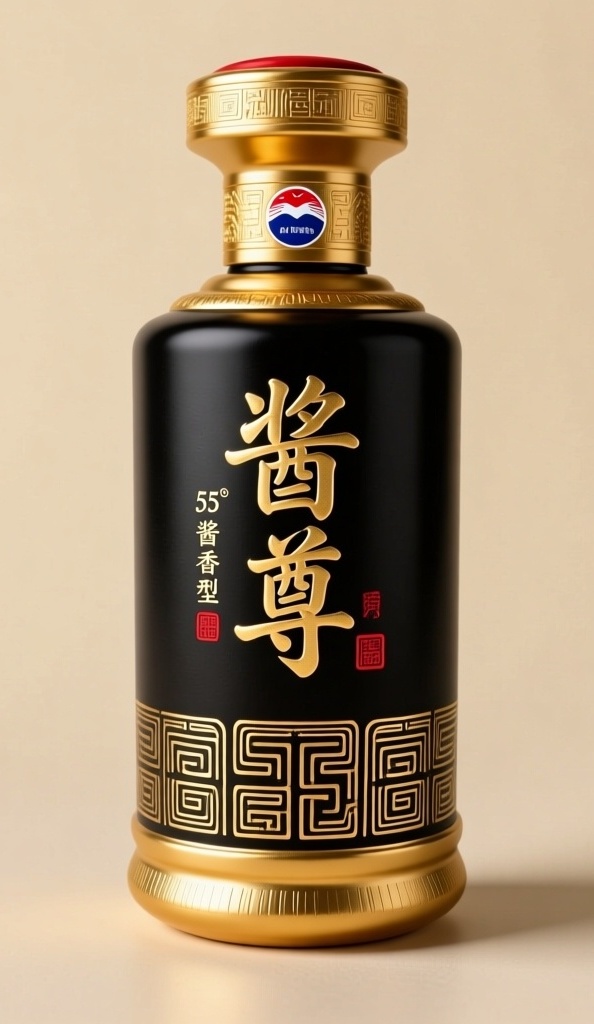围绕高端典藏级国风美学,设计53°酱香型白酒瓶贴正面正稿,面向追求文化品位与收藏价值的高端消费群体,融入“酱尊”品牌元素。设计内容为竖向长方形构图,中央以篆体“酱尊”二字居中沉稳排列,下方辅以极简金文纹样作为底纹,线条凝练如青铜铭文,整体布局疏朗有度,无多余装饰。颜色采用鎏金主色、玄黑衬底、朱砂点睛,营造庄重典雅氛围。材质选用特种艺术纸,通过烫金工艺凸显文字光泽,局部压纹增强立体触感,整体克制内敛,拒绝卡通、插画与潮流元素,严格契合茅台体系审美标准。