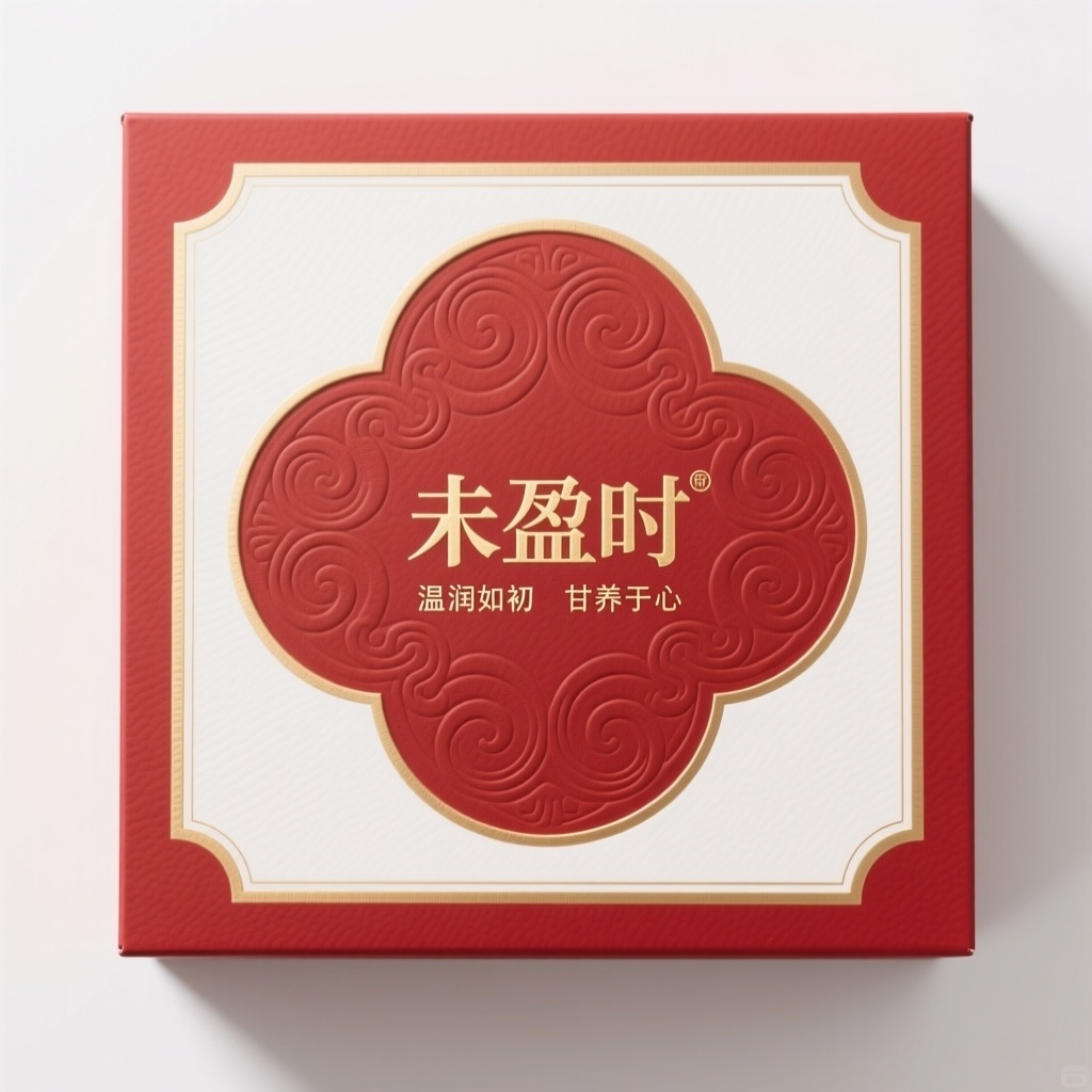 - **包装主视觉面排版**:覆盖式排版(中心对称如意回纹变体图案作为底纹微浮雕衬于版面中央,品牌名“未盈时”以无衬线烫金字居中压印其上,下方辅以四字宣传语横向排列,整体构图留白充足,上下天地空间舒展,视觉焦点集中于烫金文字与纹样交叠处)
