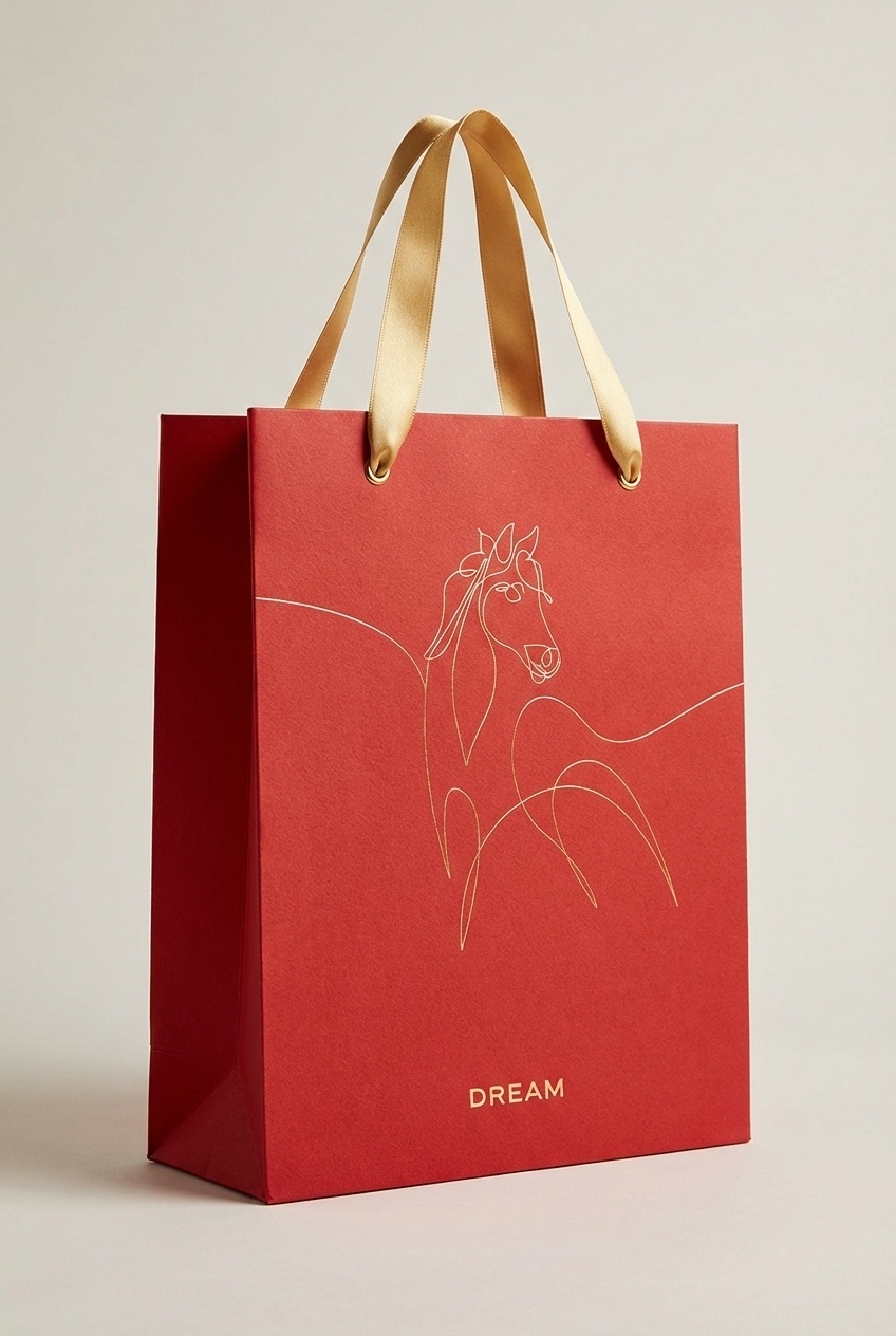 设计一个追觅2026马年新年手提袋,要求:竖版长方形立体手提袋,袋身挺括有厚度,底部为方形支撑结构;材质为哑光质感的正红色加厚铜版纸,表面带细微肌理;图案以单条流畅金色线条勾勒的抽象马形(使用第一张图中的马),线条舒展飘逸,呈现动态舒展的姿态,马形占据袋身中上部区域,线条向袋身边缘自然延伸;袋身底部居中位置印金色无衬线字体的"DREAM"字样,字号简约不夸张;构图以马形线条为视觉主体,文字居于底部平衡画面,整体留白适度,风格极简高级;配色主色调为正红色+金色(仅线条、文字、手提带使用),手提带为同色系金色缎带材质,与袋身图案色彩呼应。