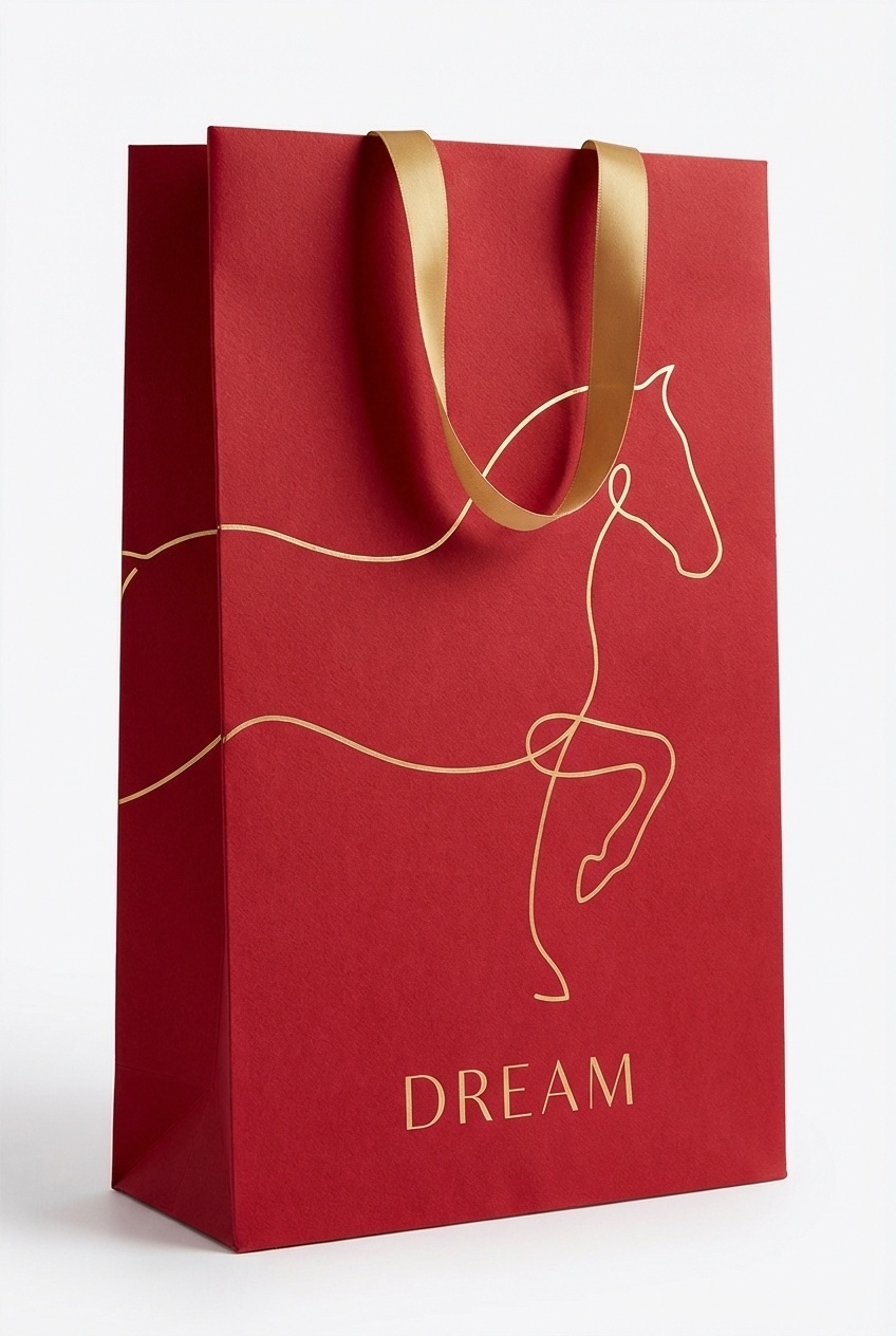 设计一个追觅2026马年新年手提袋,要求:竖版长方形立体手提袋,袋身挺括有厚度,底部为方形支撑结构;材质为哑光质感的正红色加厚铜版纸,表面带细微肌理;图案以单条流畅金色线条勾勒的抽象马形,重点调整马的头身比例使其更加协调自然,线条舒展飘逸,呈现动态舒展的姿态,马形占据袋身中上部区域,线条向袋身边缘自然延伸;袋身底部居中位置印金色无衬线字体的"DREAM"字样,字号简约不夸张;构图以马形线条为视觉主体,文字居于底部平衡画面,整体留白适度,风格极简高级;配色主色调为正红色+金色(仅线条、文字、手提带使用),手提带为同色系金色缎带材质,与袋身图案色彩呼应。