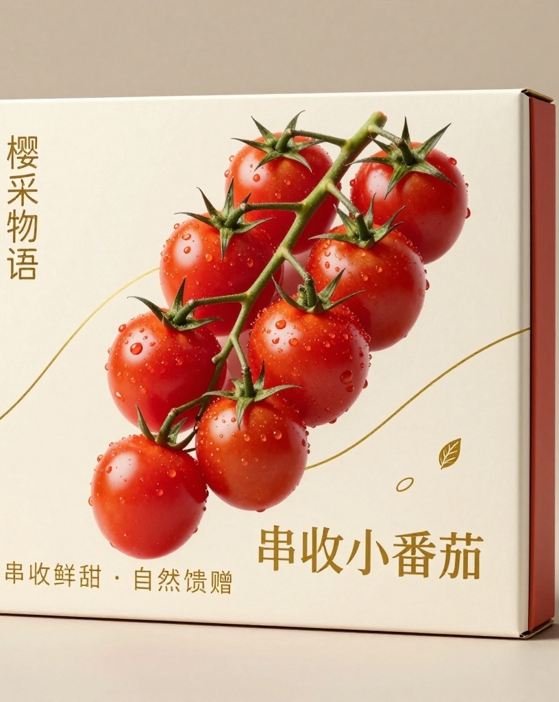 - **包装主视觉面排版**:以商品为主式排版(写实风格串收小番茄高清摄影图居于视觉中心,占据主视觉面70%面积,“串收小番茄”标题采用烫金无衬线字体横向置于图像右下方,品牌名“樱采物语”以细体小字垂直排列于左上角,形成视觉平衡与轻奢节奏)