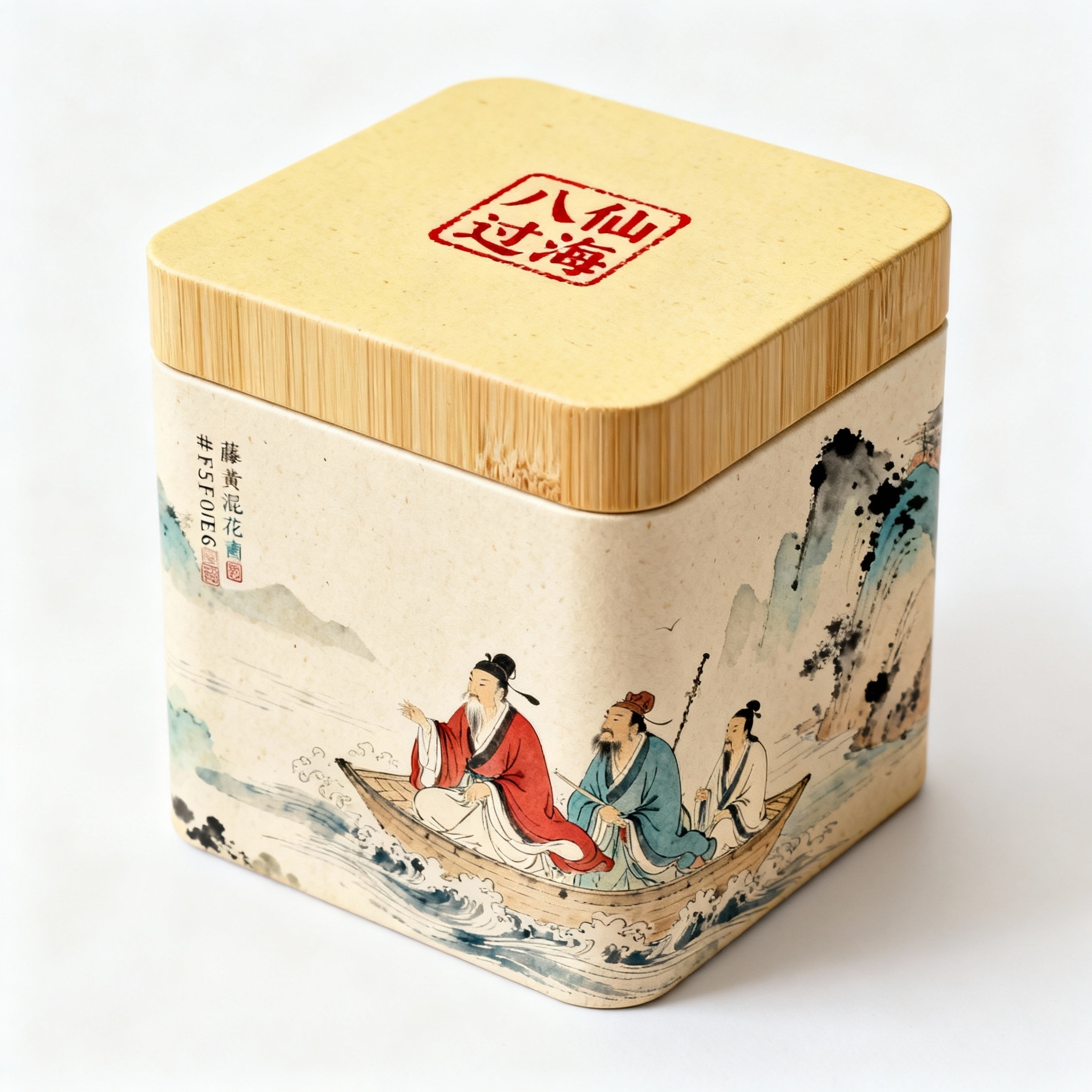 一个高端的方形茶罐包装,设计元素包括中式传统“八仙过海”手绘场景,采用工笔淡彩结合水墨肌理的画风,线条细腻柔和,色彩淡雅。主色调为浅米黄色底色(#F5F0E6),搭配低饱和的传统工笔色彩:朱红(#C94A4A)、石青(#7A8FA4)、藤黄混花青(#8FA8A0)。罐身顶部中央有红色方形印章式文字“八仙过海”,风格古朴。整体工艺效果为哑光印刷,模拟纸质/竹制罐身的柔和质感。场景呈现为简洁白底背景,突出罐身图案细节,适配包装印刷展示。风格定位为文人雅趣风,复古淡雅。