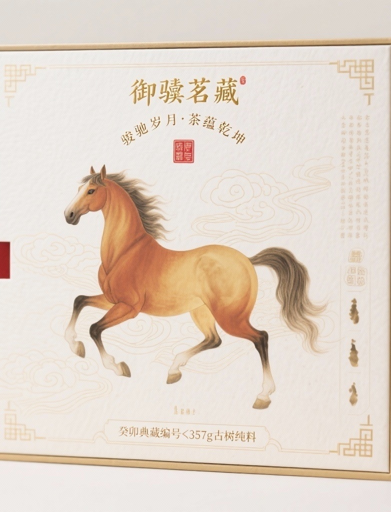 - **设计元素**:背景层为米白棉纸肌理+极细金线云纹水印;主图案为动态工笔骏马,鬃尾施以渐变赭金晕染;装饰图案含侧边竖排茶经节选小楷、马蹄印导视序列、角隅茶花缠枝纹;装饰线条用仿青铜器回纹框定信息区;小图标含“非遗监制”火漆印、“仓储建议”茶仓插画标;材质为手工裱糊硬纸板,表面局部击凸+UV哑光涂层。