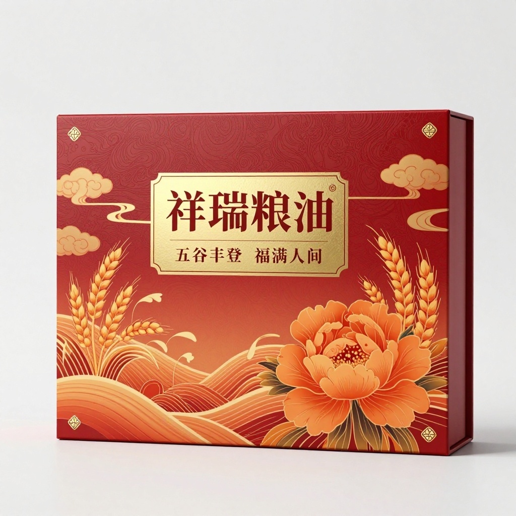 - **包装主视觉面排版**:覆盖式排版(深红底金色祥云与麦浪铺陈为背景纹理,中央偏上位置以烫金工艺呈现“祥瑞粮油”主标题,下方衬暗橙色绽放牡丹与饱满稻穗插画,文字区块使用哑光金色矩形色块托底增强识别度,视觉重心聚焦于品牌名,图案作为文化氛围烘托不喧宾夺主)