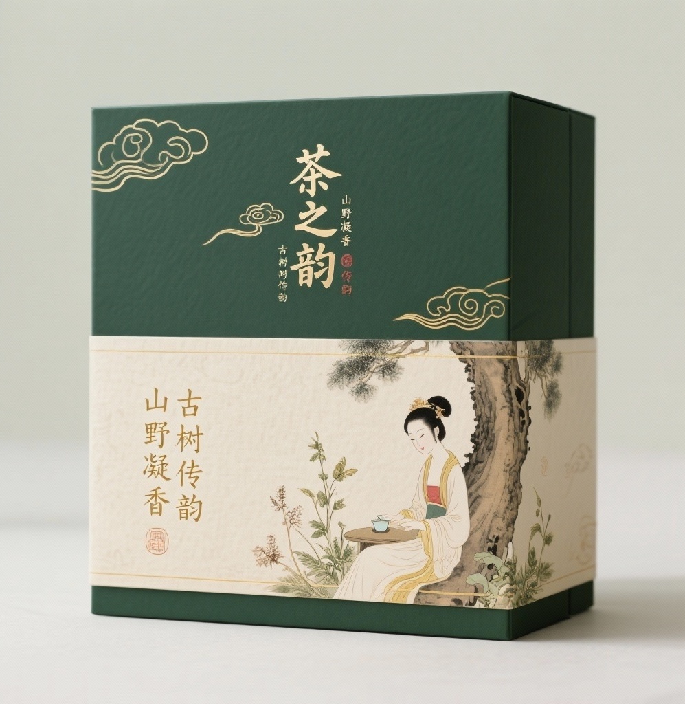 - **包装主视觉面排版**:上下排版(文字在上图案在下)——顶部居中为传统书法“茶之韵”品牌标识,辅以“山野凝香 古树传韵”竖排小字宣传语;下方满幅呈现中国画风格古典美人倚坐古树旁品茗场景,草药植物沿边自然延展,云纹装饰轻绕文字与图案衔接处,视觉重心由上至下自然引导,突出文化意境与产品属性。