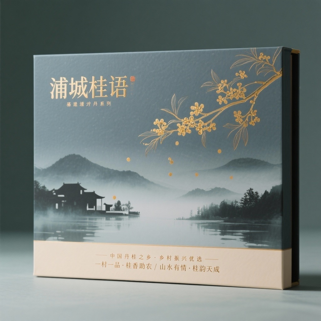 - **设计元素**:背景层为水墨晕染的远山与薄雾水面纹理;主图案为写意风格丹桂花枝斜贯画面左上方;装饰元素含细金线勾勒的村落轮廓剪影、飘落的桂花点状散落;材质选用哑光特种纸带浮雕触感,局部UV凸印桂花细节