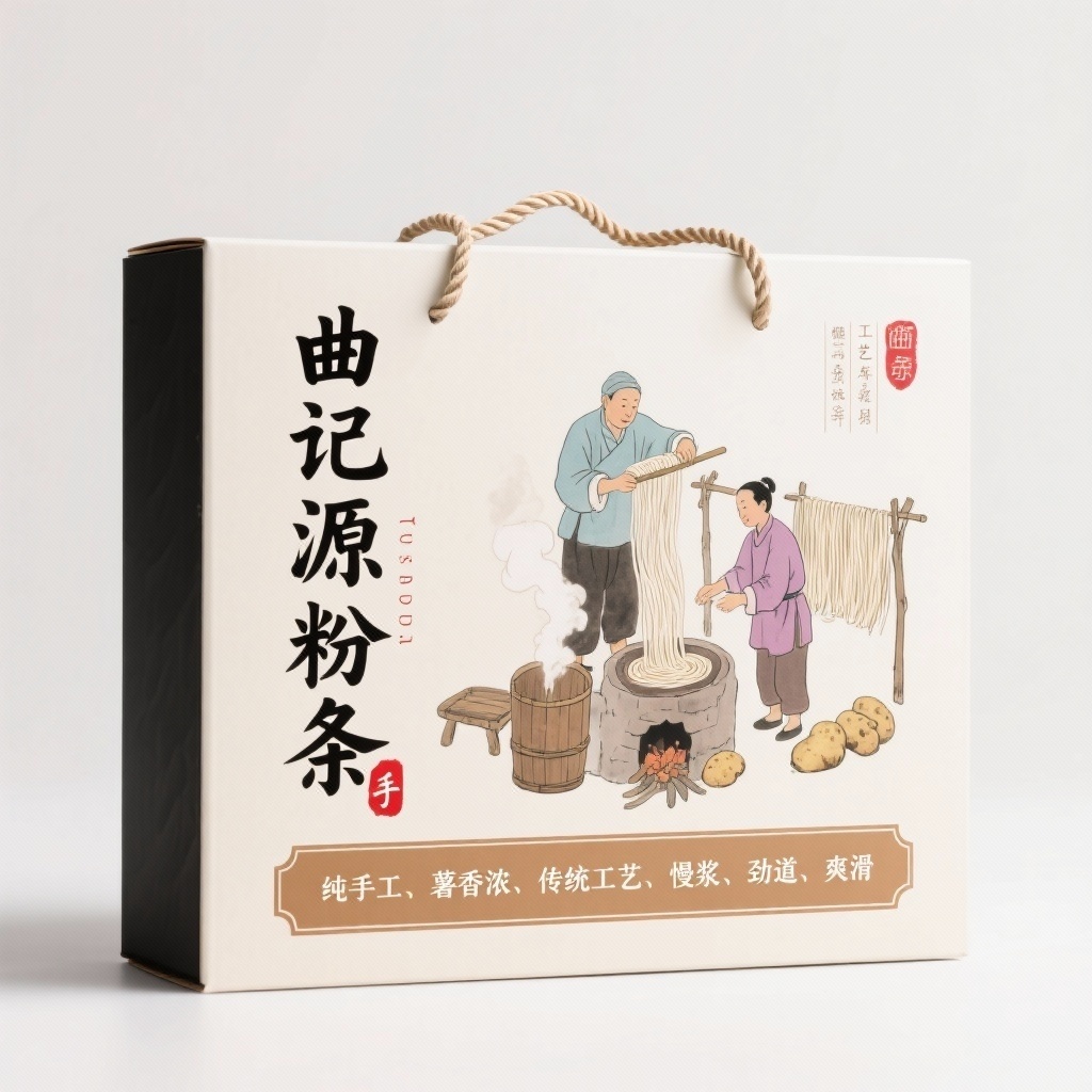 - **包装主视觉面排版**:左右排版(左侧竖排+横排书法字体“曲记源粉条”配红色“手”字印章,右侧中央为主插画场景,右上角错落竖排工艺关键词文字,底部浅棕色边框承载产品说明文字,顶部波浪绳结装饰平衡视觉)