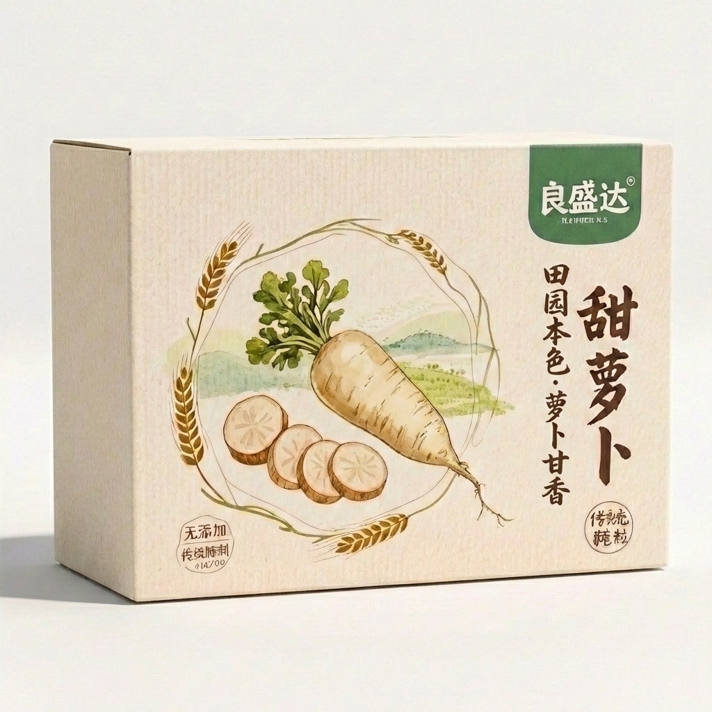 将图中的“田园本色”和“萝卜甘香”共八个字全部重新设计,统一字体风格、优化笔画节奏与视觉权重,使其更具设计感与品牌辨识度,同时保持与整体包装风格协调,其他元素不变