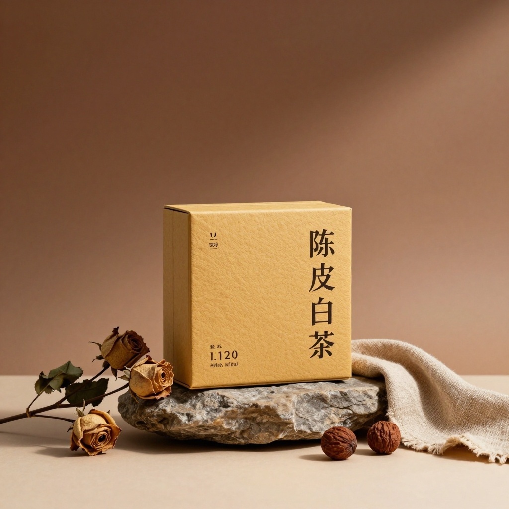 一个以陈皮白茶高端礼盒为核心的宣传海报,整体采用融合静物摄影真实质感与极简主义留白哲思的设计风格,强调自然陈韵与静奢之味的视觉张力与氛围。画面中央是一个土黄色手工纸礼盒,微哑光带细腻压纹,置于一块天然未打磨的灰褐色石头上。礼盒左侧斜倚着三枝枯萎的玫瑰枝条,右侧铺展一小块米棕色亚麻粗布,礼盒前方散落着三颗饱满的圆形干果。背景为从深赭石到浅陶土的垂直渐变暖棕色,无任何纹理。画面右上45度角有柔和自然光源,营造出细腻的光影层次和空间纵深感。整体色调温暖、低饱和,材质真实可触,细节精微,打造出独特、凸显贵价茶叶高端品质的视觉效果。