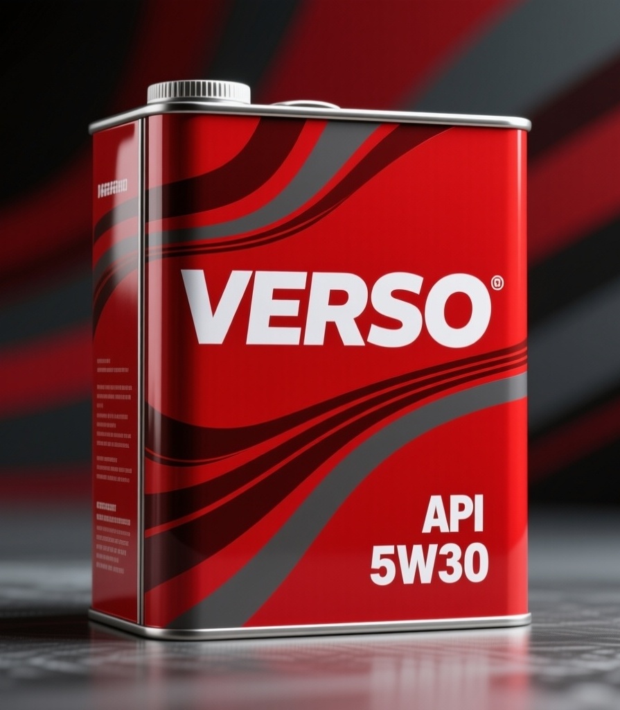 一个高端的方形金属罐装汽车发动机油包装,全包围式标签。设计风格为强烈的工业风与现代科技感,线条利落。主色调是鲜艳的正红色(#FF0000),背景有深红和暗灰的抽象流线型条纹增加层次。品牌名“VERSO”使用超大号、加粗的白色无衬线字体居中置于罐体正面。产品型号“API SQ 5W30”用清晰、中等大小的白色粗体字显著地放在右下角。整体氛围专业、可靠、高效,具有视觉冲击力。