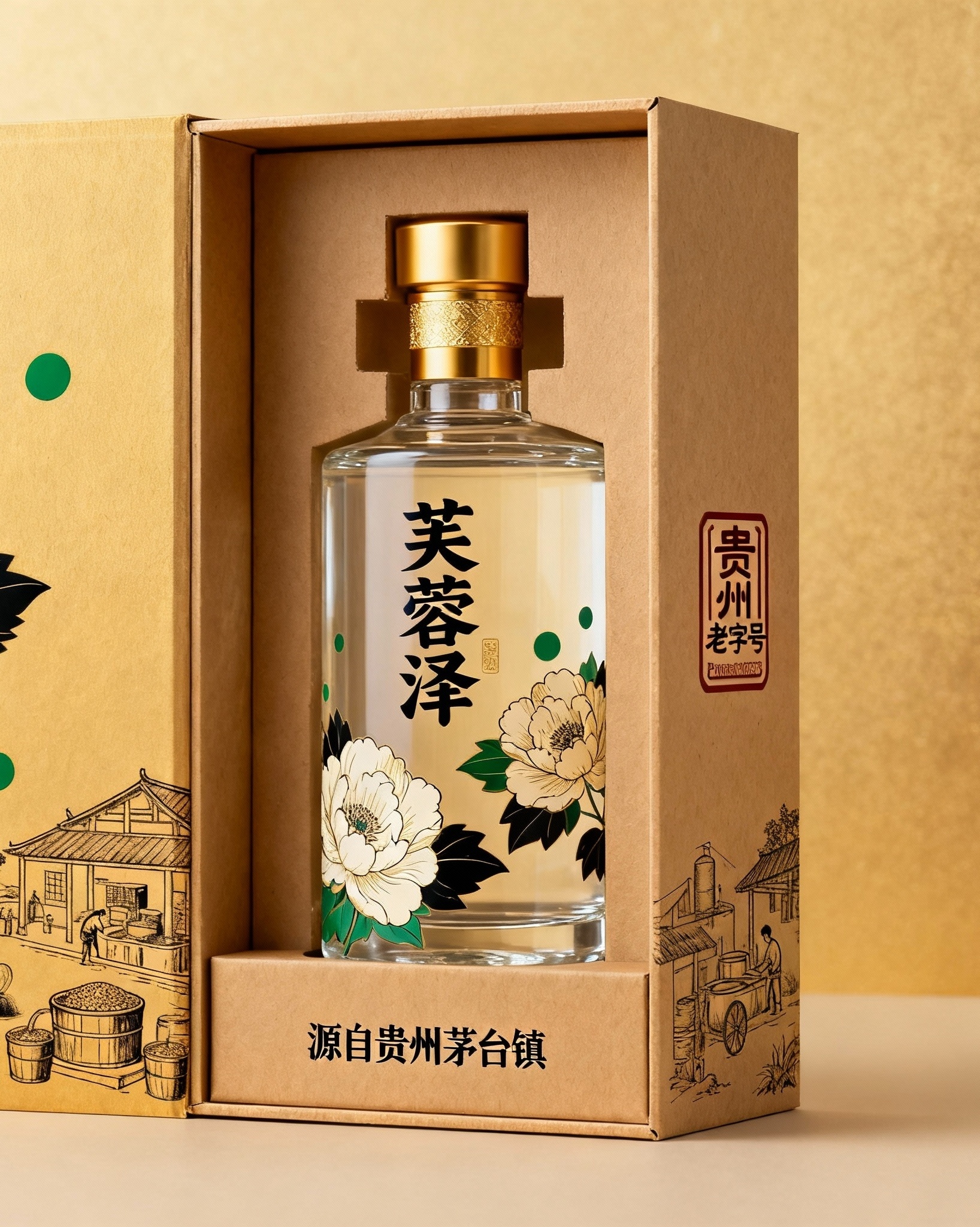 一个高端的透明玻璃瓶配金色瓶盖的白酒包装,外加长方形纸质礼盒,用于酱香型白酒“芙蓉泽”,采用融合传统与现代的“古韵新风”风格。“芙蓉泽”是品牌名,“贵州老字号”和“源自贵州茅台镇”是核心信息。设计元素包括手绘风格的芙蓉花图案、传统农耕或酿酒作坊插画、以及“贵州老字号”印章式Logo。暖金(Pantone 871C)作为主色调,深黑(Pantone Black 6C)用于文字,墨绿(Pantone 563C)点缀芙蓉花瓣,整体营造出庄重、典雅、高端且富有文化内涵的氛围。
