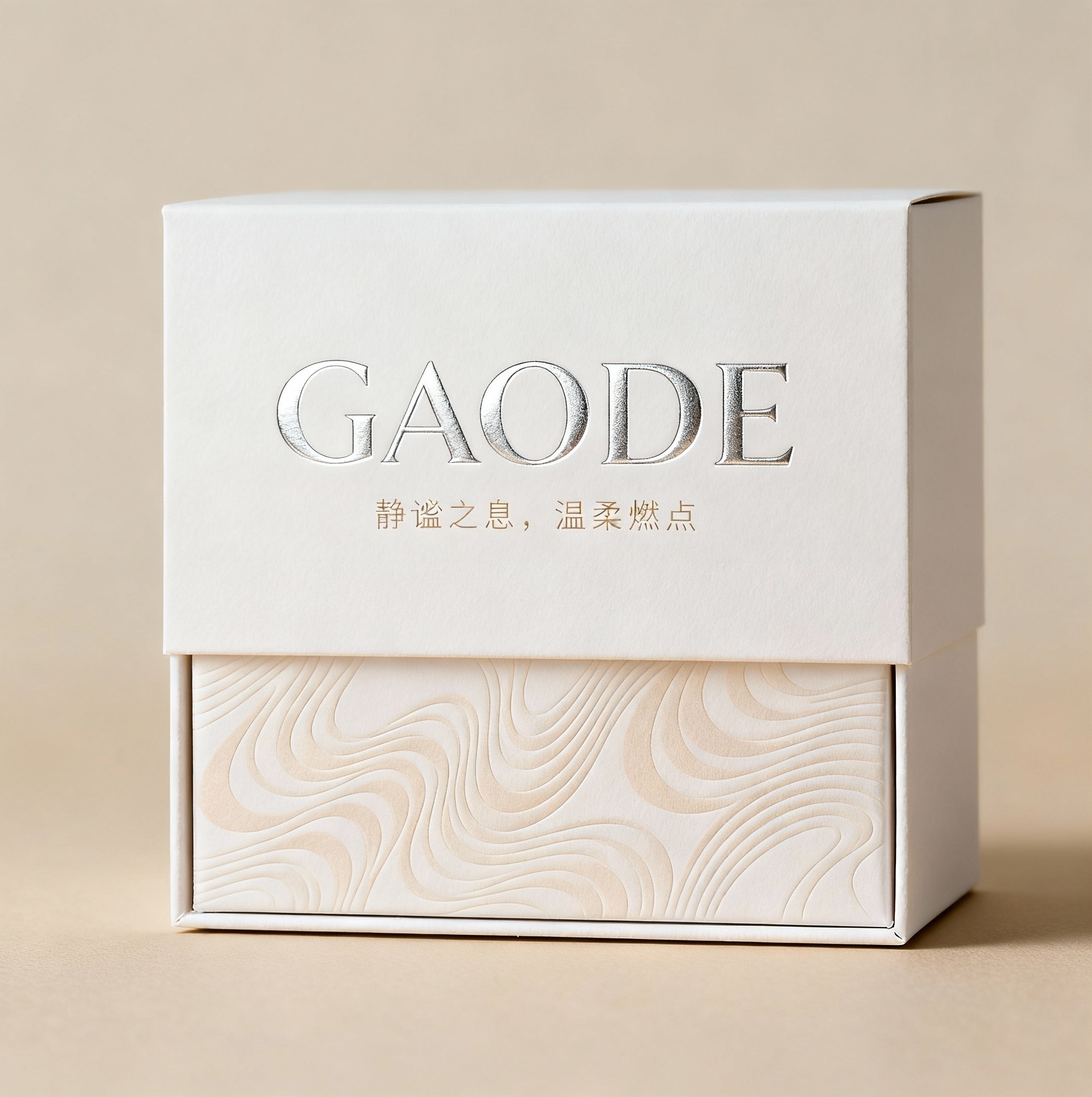 - **包装主视觉面排版**:以文字为主式排版,主标题“GAODE”居于视觉中心偏上位置,采用烫银工艺大字呈现,下方搭配四字宣传语“静谧之息,温柔燃点”以浅杏色细体小字横向排列;抽象波浪暗纹作为底纹低调铺满整个版面,营造流动呼吸感,不干扰文字识别但增强层次。