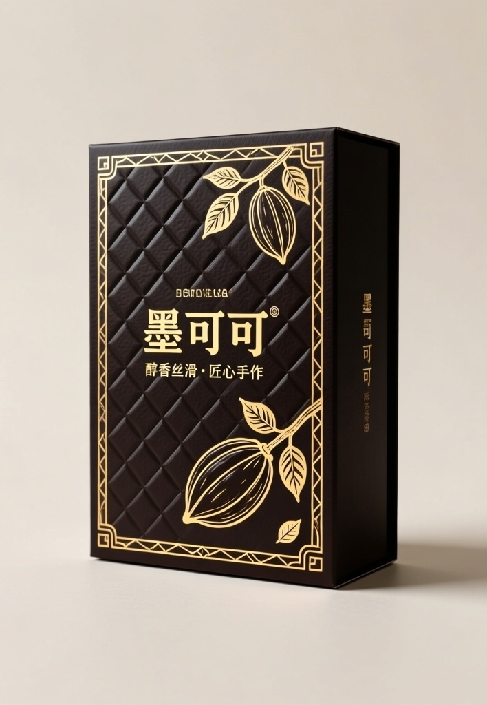 产品:手工黑巧克力礼盒 品牌名:墨可可 包装样式:长方形礼品盒 包装主视觉面排版:覆盖式排版,深色巧克力纹理衬底,品牌名“墨可可”以烫金粗体居中突出,下方辅以“醇香丝滑·匠心手作”四字小标,文字边缘嵌浅灰柔光色块增强辨识度 设计风格:新国风极简主义 设计元素:背景为哑光黑压纹纸质感,主图案为手绘可可豆枝蔓缠绕边框,装饰线条为细金线勾勒几何菱形纹,角落点缀微型可可叶小图标 主题配色:主色深褐,辅色鎏金