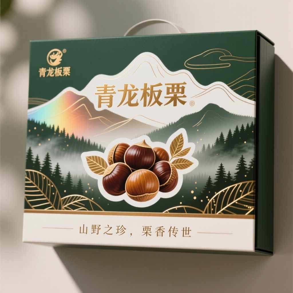 - **设计元素**:背景层为动态全息渐变纹理模拟晨雾山林;主图案为写实风格板栗果实簇拥成环状,叠加抽象山脉剪影轮廓线;装饰元素含细密金色叶脉线条与微光粒子点缀;材质选用高光泽镭射纸基,触感柔韧带金属反光质感